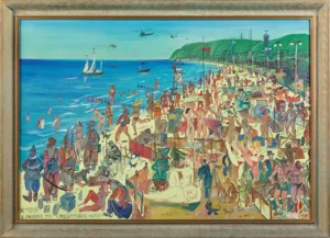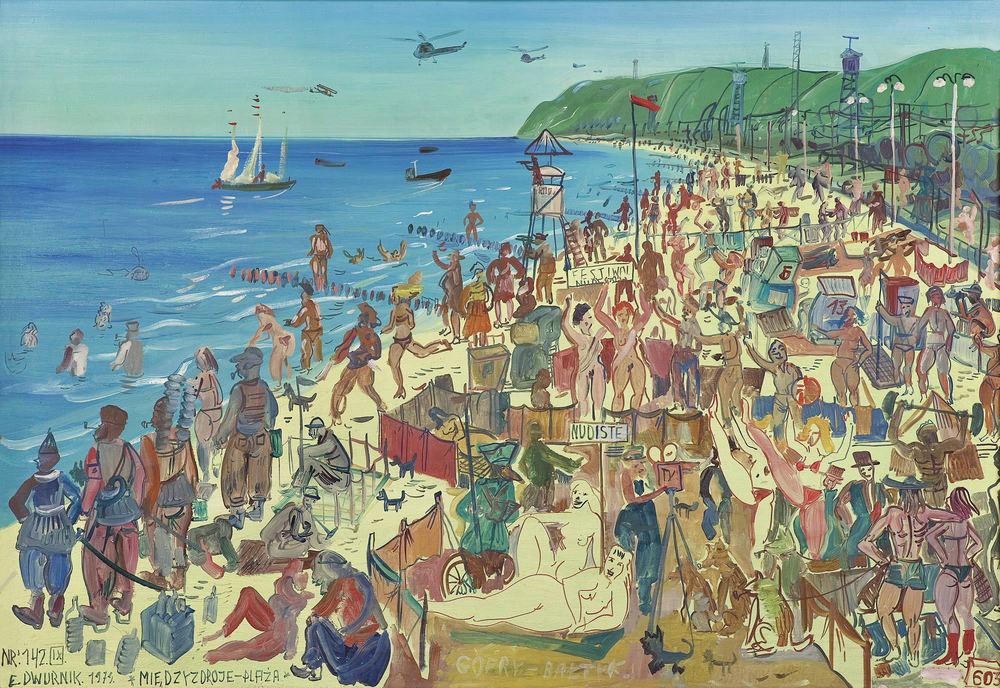 Edward Dwurnik (Radzymin 19 IV 1943 - Warszawa 28 X 2018) studiował malarstwo w ASP w Warszawie (1963-1970), jednak jako swego „mistrza“ wymienia Nikifora. Jego to prace, zobaczone po raz pierwszy w 1965, zainspirowały ówczesnego studenta III roku do narysowania pierwszych prac z cyklu „Podróże autostopem“, które kontynuował w nastepnych latach. W 1972-1978 powstawał cykl „Sportowcy“, w którym portretowane były, dodajmy - kąśliwie, typowe postaci z lat 70. Równolegle od 1975 powstawał cykl „Robotnicy“, który kulminował w okresie „Solidarności“ 1980-1981. Za prace z tego cyklu Dwurnik otrzymał w 1981 Nagrodę Krytyki Artystycznej im. Cypriana Kamila Norwida, natomiast za obrazy z cyklu „Warszawa“ (1981), proroczo zapowiadające stan wojenny - Nagrodę Kulturalną „Solidarności“ podziemnej w 1983. W latach 80. malarstwo Dwurnika przybrało wyraz ekspresyjny i dramatyczny. Powstające w tej dekadzie obrazy miały niejednokrotnie wymowę polityczną, przybierały też kostium historyczny, tak czy inaczej odnoszący się do współczesnych spraw i realiów. Cykl „Droga na Wschód“ (1989-91) upamiętniał ofiary stalinizmu, natomiast cykl „Od Grudnia do Czerwca“ (1990-94) - ofiary stanu wojennego. Zarówno ideowe, jak i czysto malarskie walory tych prac przyniosły artyście ogromne uznanie, zarówno w kraju jak i za granicą. Jego wyrazem była prestiżowa nagroda Fundacji Coutts & Co w Zurychu (1992). W latach 90. powstają cykle będące kontynuacją „Podróży autostopem“: „Niebieskie miasta“ (od 1993) i „Diagonale“ (od 1996), jak również kompozycje nowego typu, jak widoki morskie (cykl „Błękitne“, 1992-93) czy cykl „Wyliczanka“ (1996-99). Artysta wiele wystawia, miał ok. 100 wystaw indywidualnych w Polsce i za granicą, brał też udział w licznych wystawach i festiwalach krajowych i międzynarodowych, m.in.: X Biennale Sztuki Współczesnej, Menton 1974, Documenta 7, Kassel 1982, 5th Biennale, Sydney 1985, XIX Biennale Sztuki, Sao Paulo 1987; Olimpiada Sztuki, Seul 1988. Równolegle z malarstwem uprawiał rysunek, collage, grafikę warsztatową (litografia, techniki metalowe, kserografia, stemple) i użytkową (ilustracja, plakaty do własnych wystaw indywidualnych).