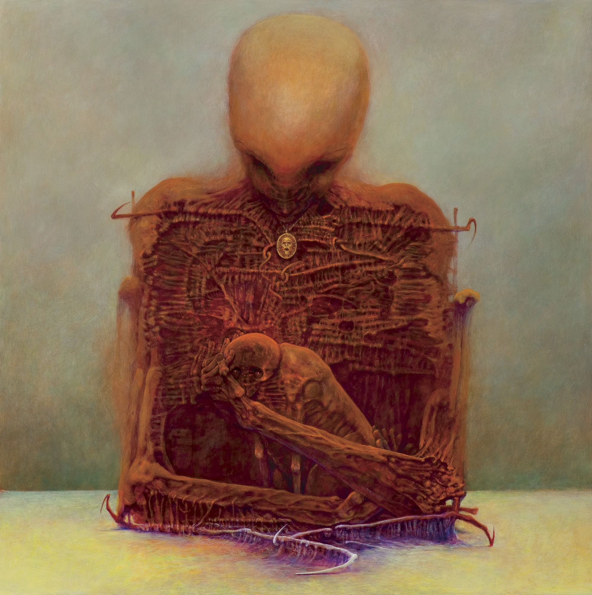 Zdzisław Beksiński (Sanok 24 II 1929 - Warszawa 21 II 2005) studiował w latach 1947-1952 na Wydziale Architektury Politechniki Krakowskiej. Był artystą samoukiem, który osiągnął niekwestionowaną pozycję w polskiej sztuce współczesnej, potwierdzoną obecnością jego prac na prestiżowych wystawach i w kolekcjach muzealnych. Początkowo zajmował się fotografią, którą interesował się od lat studenckich, po 1956 zyskując uznanie jako twórca fotogramów o estetyce opartej o efekty fakturowe. W latach 1958-1962 tworzył abstrakcyjne obrazy-reliefy o bogatej fakturze, głównie metalowe, będące odmianą malarstwa materii. Pod koniec tego okresu powstawały ażurowe formy o kształtach figur i pełnoplastyczne rzeźby w metalu. Kolejnym etapem jego twórczości były lata 1962-1974, kiedy poświęcał się głównie rysunkowi. W latach 60. rysował piórkiem i tuszem figuralne kompozycje odznaczające się karykaturalną deformacją postaci. Od końca lat 60. tworzył rysunki węglem i kredkami, będące monochromatyczną odmianą jego równoległej twórczości malarskiej. Od 1974 zajmował się niemal niepodzielnie malarstwem. Jego charakterystyczny styl bazował na perfekcji technicznej, której towarzyszyła niezwykłość wizji. Malował świat po katastrofie, naznaczony piętnem śmierci i rozpadu. Jego obrazy zaludniają postaci i stwory o ludzkich wprawdzie bądź zwierzęcych kształtach, lecz o cechach fantomów, automatów lub rozpadających się trucheł. Artysta nie nadawał swym obrazom i rysunkom tytułów (poza porządkującymi symbolami), akcentując w ten sposób swój brak zainteresowania dla literackiej strony przedstawień. Sam mówił, że malując całkowicie poddaje się wizji, „fotografuje“ ją. W ostatnich latach włączył do swego warsztatu artystycznego elektroniczne techniki generowania obrazu, które wykorzystywał do tworzenia komputerowych fotomontaży. Sztuka Beksińskiego, wielokrotnie wystawiana i omawiana, budzi skrajne emocje wśród znawców i publiczności.
