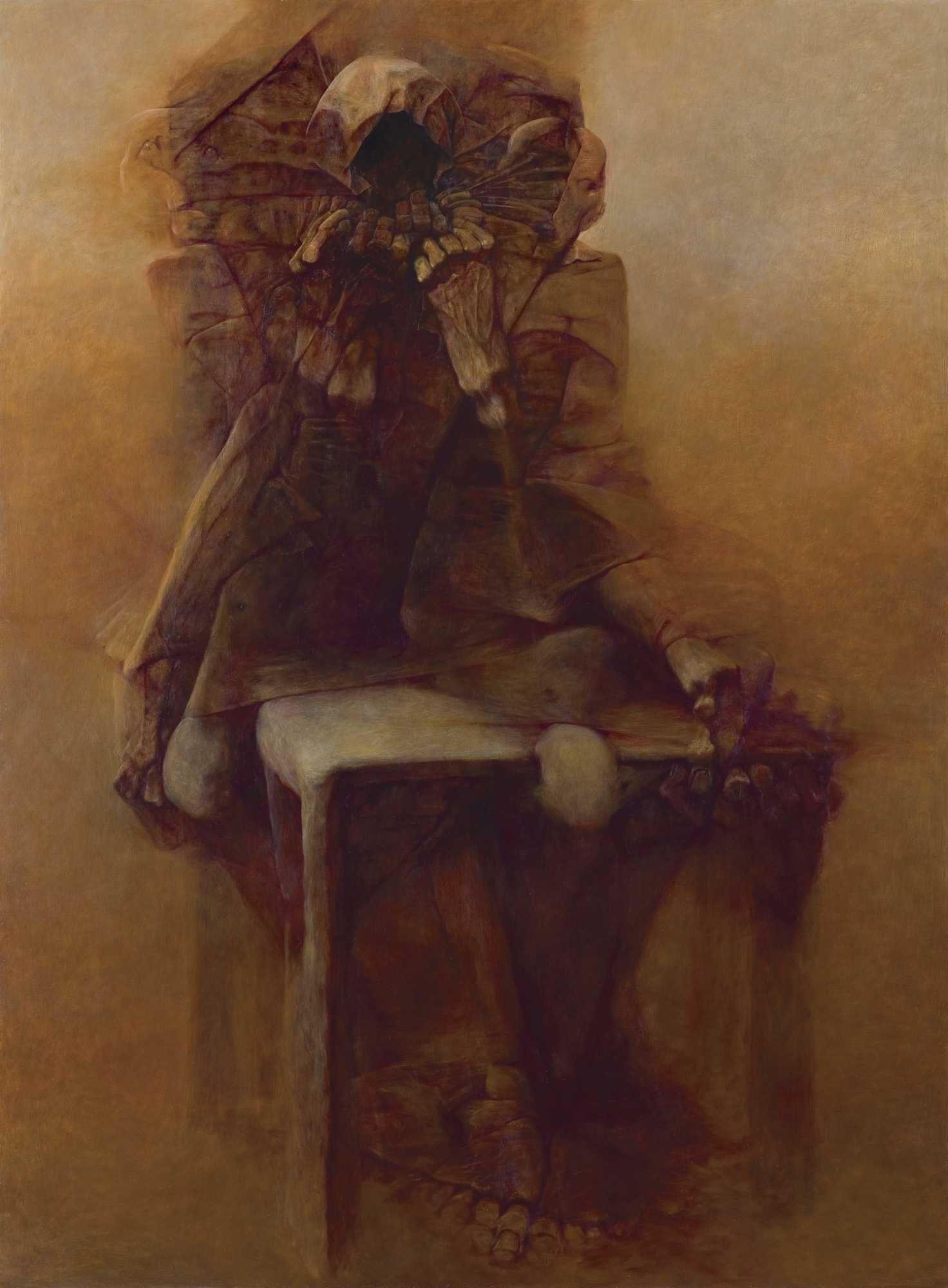 Zdzisław Beksiński (Sanok 24 II 1929 - Warszawa 21 II 2005) studiował w latach 1947-1952 na Wydziale Architektury Politechniki Krakowskiej. Był artystą samoukiem, który osiągnął niekwestionowaną pozycję w polskiej sztuce współczesnej, potwierdzoną obecnością jego prac na prestiżowych wystawach i w kolekcjach muzealnych. Początkowo zajmował się fotografią, którą interesował się od lat studenckich, po 1956 zyskując uznanie jako twórca fotogramów o estetyce opartej o efekty fakturowe. W latach 1958-1962 tworzył abstrakcyjne obrazy-reliefy o bogatej fakturze, głównie metalowe, będące odmianą malarstwa materii. Pod koniec tego okresu powstawały ażurowe formy o kształtach figur i pełnoplastyczne rzeźby w metalu. Kolejnym etapem jego twórczości były lata 1962-1974, kiedy poświęcał się głównie rysunkowi. W latach 60. rysował piórkiem i tuszem figuralne kompozycje odznaczające się karykaturalną deformacją postaci. Od końca lat 60. tworzył rysunki węglem i kredkami, będące monochromatyczną odmianą jego równoległej twórczości malarskiej. Od 1974 zajmował się niemal niepodzielnie malarstwem. Jego charakterystyczny styl bazował na perfekcji technicznej, której towarzyszyła niezwykłość wizji. Malował świat po katastrofie, naznaczony piętnem śmierci i rozpadu. Jego obrazy zaludniają postaci i stwory o ludzkich wprawdzie bądź zwierzęcych kształtach, lecz o cechach fantomów, automatów lub rozpadających się trucheł. Artysta nie nadawał swym obrazom i rysunkom tytułów (poza porządkującymi symbolami), akcentując w ten sposób swój brak zainteresowania dla literackiej strony przedstawień. Sam mówił, że malując całkowicie poddaje się wizji, „fotografuje“ ją. W ostatnich latach włączył do swego warsztatu artystycznego elektroniczne techniki generowania obrazu, które wykorzystywał do tworzenia komputerowych fotomontaży. Sztuka Beksińskiego, wielokrotnie wystawiana i omawiana, budzi skrajne emocje wśród znawców i publiczności.