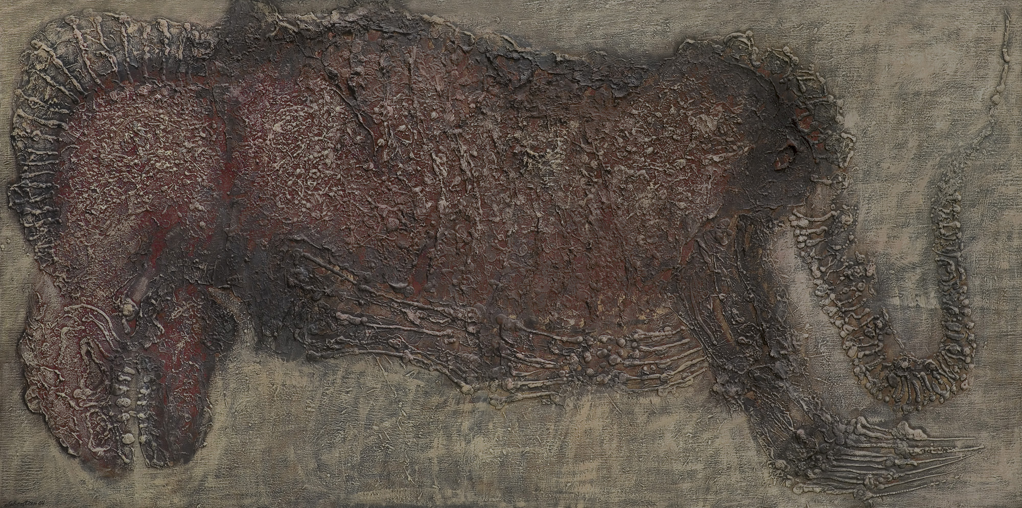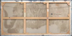 – na górnej listwie krosna nalepka (druk/maszynopis): Expos. „Surréalisme et l’Art Fantastique“ | (Pologne) | BIENNALE DE SĂO PAULO septembre-novembre 1965 [data czerwonym tuszem] | nom et prénom: LEBENSTEIN Jan, | Titre de l’oeuvre: Patagonien, 1964 | Cat...et dimensions: 97 x 195 | Huile | Artiste | [poniżej adres nieczytelny z powodu uszkodzenia nalepki];