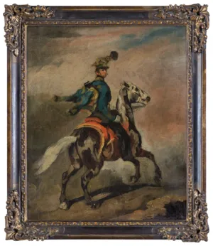 Wspomniane dzieło, Huzar na siwym koniu (obecnie w zbiorach Osterreichische Galerie Belvedere w Wiedniu), znane również pod tytułem Błękitny huzar, jest datowane na lata 1836-1837. Jest to analogiczna dla oferowanej wersja kompozycji, przedstawiająca huzara na wspiętym koniu. Obie wersje różni jedynie maść konia (siwy na obrazie wiedeńskim i gniady na oferowanym płótnie) oraz nieco inne upozowanie kawalerzysty. Postać na obrazie wiedeńskim jest odwrócona od widza, jej twarz jest widoczna jedynie w zarysie – jeździec na „naszym“ obrazie jest natomiast lekko zwrócony ciałem w prawo, głowę zaś odwraca, spoglądając na widza. Ruch huzara przedstawionego na oferowanym dziele jest przy tym podkreślony przez powiewające rękawy mentyka narzuconego na dolman.
