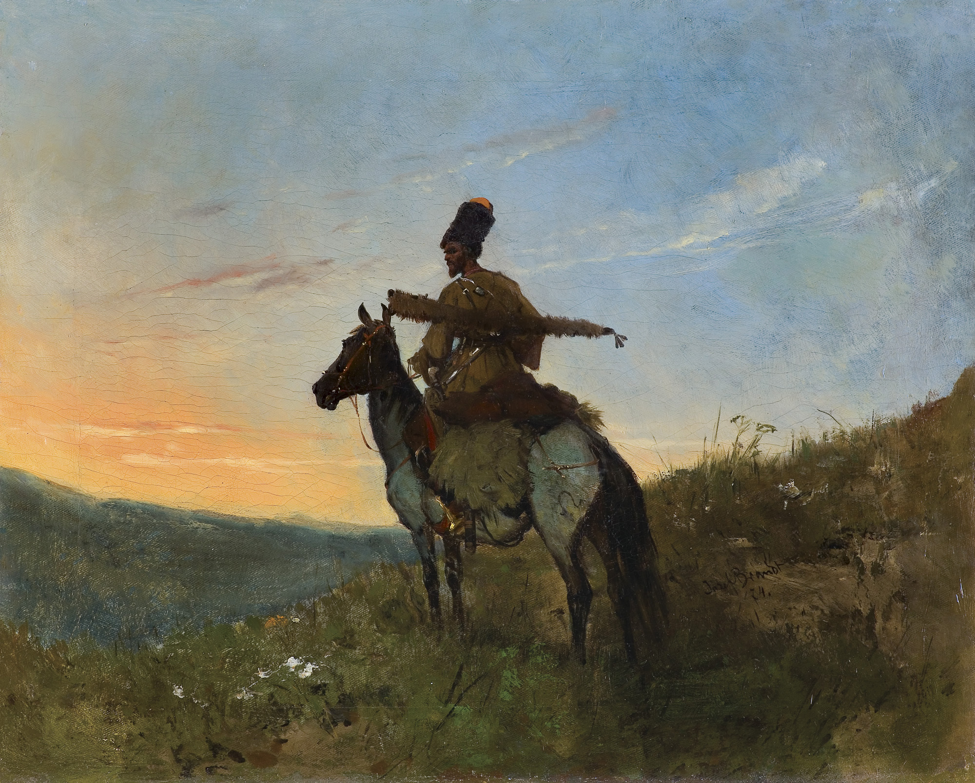 Obraz powstał we wczesnym okresie w pełni już dojrzałej twórczości Józefa Brandta. Początkujący malarz nauki rozpoczynał w paryskiej pracowni Juliusza Kossaka. Ich wspólna praca szybko przekształciła się w serdeczną przyjaźń, a scaliła ją fascynacja dawnymi dziejami ojczyzny. Obaj artyści, po powrocie do Warszawy w 1871, udali się w pierwszą wspólną wyprawę na Ukrainę. Brandt miał tam w przyszłości jeszcze wielokrotnie wracać. W czasie podróży malarz bacznie obserwował życie oraz obyczaje zamieszkujących odludzia mieszkańców. Wszystko, co zobaczył, skrupulatnie szkicował; przywiózł ze sobą notatki, a przede wszystkim liczne szkice i rysunki. W późniejszych latach wiele z tych obserwacji, wzbogaconych o opisane w literaturze historyczne wydarzenia przeniósł na płótnie. Odtąd bowiem, ten bajeczny świat stał się dla niego skarbnicą najprawdziwszej, żywej wciąż historii. Bohaterem obrazów artysty stał się człowiek o cechach indywidualnych, utożsamiany jako świadek miejsca i epoki. Mieszkaniec Kresów, wolny Kozak, żyjący pośród stepów i zaprzyjaźniony z koniem. Wacław Husarski słusznie przyjął, że okres 1863-1870, nazywany drugim okresem twórczości, jest czasem wznoszenia się Brandta na szczyt dojrzałości i sławy. Początek lat 70. XIX w. otwiera szczytowy i najbardziej dojrzały okres w jego artystycznej biografii. Artysta ukształtował już wówczas dobry warsztat w postaci pewnego, szybkiego rysunku ołówkiem, a następnie pędzlem, wykonane w charakterystycznej manierze. Rok 1874 był dla artysty przełomowy. Wtedy powstało arcydzieło Powitanie stepu, które przyniosło artyście sławę, zaszczyty, odznaczenia i liczne zamówienia. Prezentowaną scenę można zaliczyć do typowych tematów, przedstawiających ulubione przez artystę stepowe życie prostych kozackich żołnierzy na kresach XVII-wiecznej Rzeczpospolitej, obecnie Ukrainy, zwanej Zaporożem. Przedstawiony na obrazie Kozak, został ukazany wśród stepowych łąk. Dosiadający kozackiego konika jeździec, wpatruje się w bezkresny step. Ze stroju zwraca uwagę wysoka kozacka czapa, zwana papachą oraz przewieszony przez plecy, znajdujący się w futrzanym futerale karabin. Na zadzie siwego konia wyraźnie odznacza się znak własnościowy. Poza przedstawieniem postaci i konia typowe dla Brandta jest szare niebo oraz stepowy pejzaż z wyczesanymi wiatrem trawami, których zieleń jest nieraz przerwana białym kwiatem kobłuczki. Obraz w wielu miejscach został namalowany wyraźnie odznaczającymi się impastami. Mocne uderzenia pędzla podkreślają styl malowania mocno osadzony kolorystycznie w szkole monachijskiej i wczesnym okresie twórczości mistrza. Cechy stylowe obrazu, jak rysunek postaci, sposób kładzenia farby, użyta kolorystyka oraz format świadczą o autorskiej pracy Józefa Brandta, powstałej na początku lat 70. XIX w.