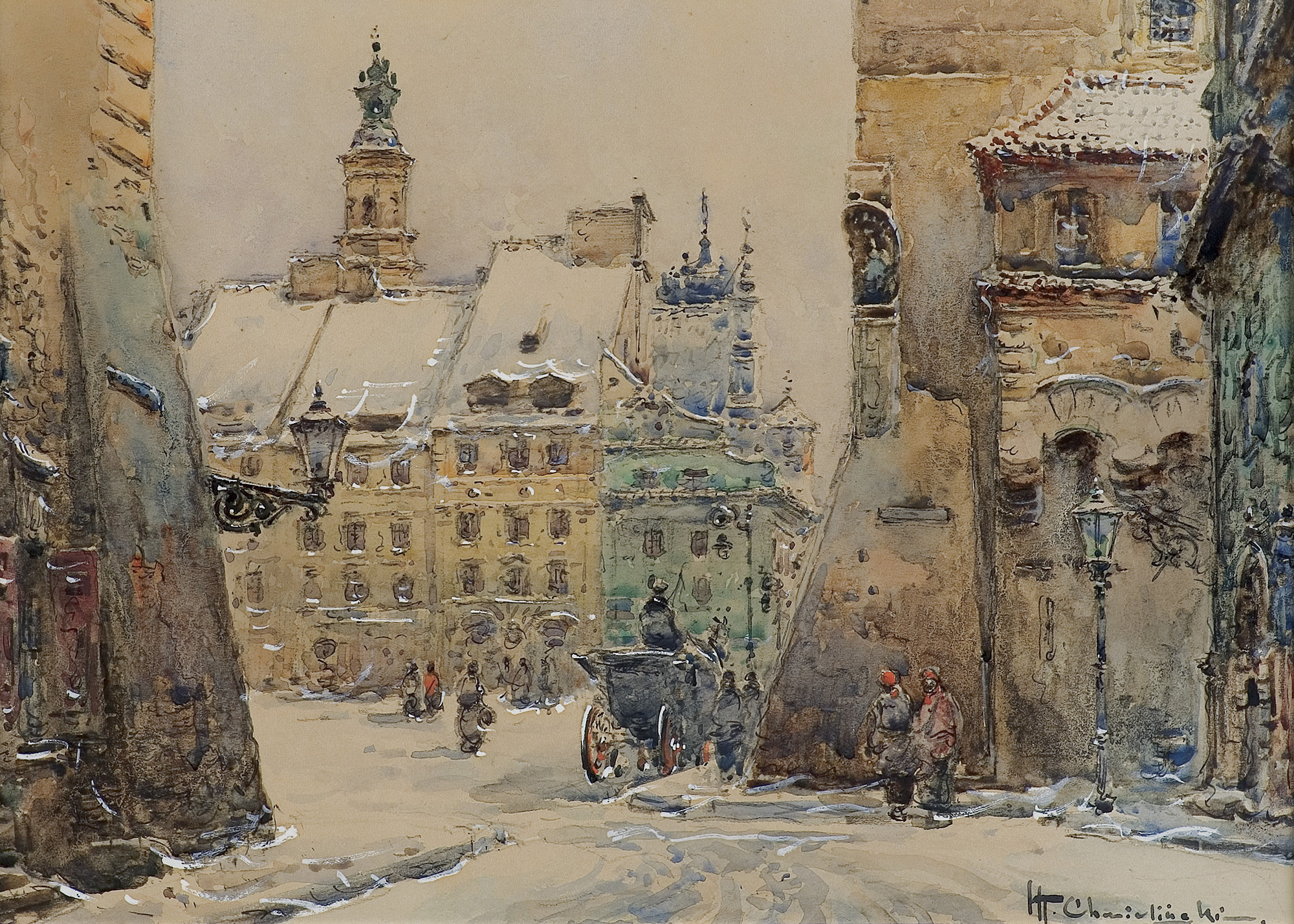 Władysław Chmieliński (Warszawa 1911 - Warszawa 1979) był malarzem związanym z Warszawą, gdzie stale mieszkał i pracował. W latach 1926-1931 studiował w warszawskiej Miejskiej Szkole Sztuk Zdobniczych i Malarstwa (dawna Klasa Rysunkowa). Wiodącym tematem jego obrazów były widoki miejskie, malowane olejno i akwarelą. W latach 1935-1938 stworzył cykl akwarel przedstawiających obiekty polskiej architektury; wśród nich, widoki Sandomierza, Krakowa, Kazimierza nad Wisłą, a także wnętrza zabytkowych kościołów czy pałaców, m.in. Zamku Królewskiego w Warszawie i Pałacu w Wilanowie. Malował także pejzaże i wiejskie sceny rodzajowe – kuligi, sanny, zaprzęgi, wesela, konie na tle krajobrazu. W latach 1967-1969 wyjeżdżał na dłuższe pobyty do Danii. W latach 1936-1939 artysta używał także pseudonimu „Władysław Stachowicz”.