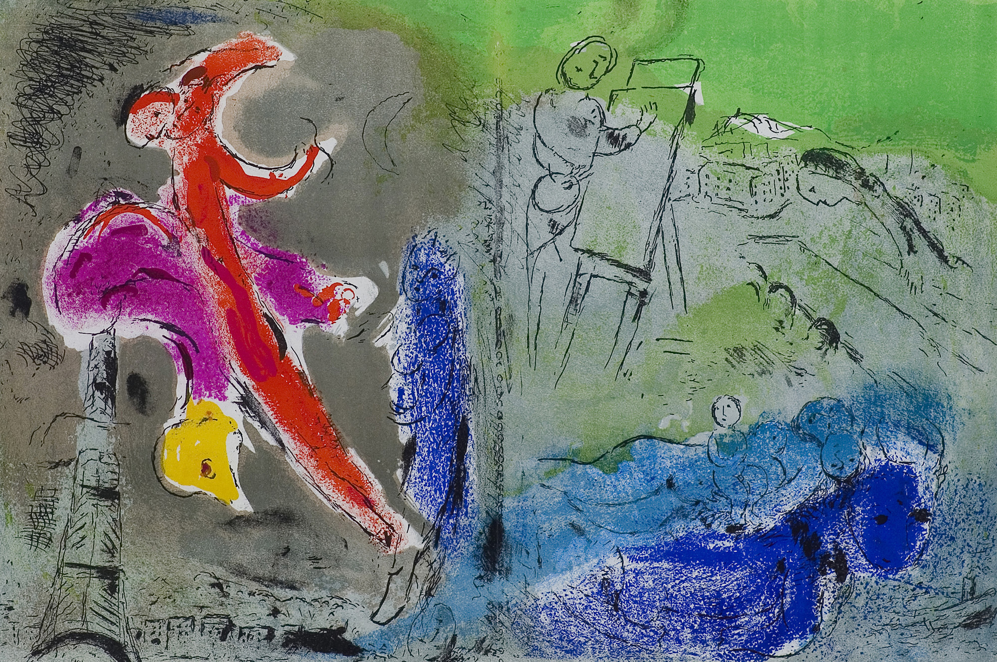 Marc Chagall uczył się rysunku u witebskiego malarza nazwiskiem Juda Pen, następnie od 1907 studiował w Akademii petersburskiej. W 1910 wyjechał na stypendium do Paryża. Zamieszkał w La Ruche na Montparnassie, wszedł do kręgu artystów, wśród których byli m.in. Modigliani, Soutine, Delaunay. W 1914 wrócił do Witebska, w 1915 poślubił Bellę (zm. 1944), muzę i bohaterkę wielu obrazów. W latach 1915-1917 mieszkał w Sankt Petersburgu, gdzie zastała go rewolucja. Mianowany komisarzem sztuk pięknych na obszar Witebska, założył tam i prowadził w latach 1918-1919 szkołę artystyczną, której profesorami byli m.in. Kazimierz Malewicz i El Lissitzky. W 1919 przeniósł się do Moskwy, gdzie do 1922 był kierownikiem artystycznym Państwowego Teatru Żydowskiego. W 1923 ostatecznie opuścił Rosję, osiedlając się w Paryżu. We Francji spędził resztę życia, z przerwą w latach 1941-1947, kiedy to schronił się w Nowym Jorku. Jego styl, wykształcony w młodości niezależnie od równoległych kierunków w sztuce, pozostał w ciągu życia artysty mało zmieniony. Wyobraźnia i sposób obrazowania Chagalla, zbliżone do sztuki naiwnej, wpisały się najsilniej w nurt surrealizmu, stając się jego znaczącym rozszerzeniem. Chagall łączył poetyckość i cudowność swych fantazji z rozwiniętym warsztatem malarza-kolorysty. Był też utalentowanym i płodnym grafikiem (cykle ilustracji do "Martwych dusz" Gogola, 1923-1927, "Bajek" La Fontaine’a, 1927-1930, Biblii, 1931-1955 – każdy cykl liczył ponad 100 plansz w technikach metalowych). Zajmował się scenografią (projekty dla Metropolitan Opera w Nowym Jorku, 1945, Opery w Paryżu, 1958), malarstwem monumentalnym (plafon w Operze paryskiej, 1963-1964), projektował witraże, dekoracje ceramiczne.