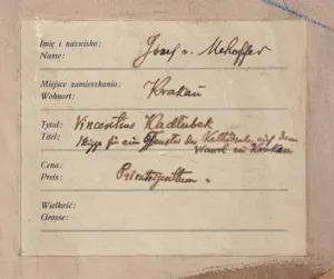 – centralnie umieszczona naklejka [druk, tusz]: Imię i nazwisko: | Name: Józef v. Mehoffer | Miejsce zamieszkania: | Wohnort: Krakau | Tytuł: | Titel: Vincentius Kadłubek | Skizze für ein Fenster der Kathedrale auf dem | Wawel zu Krakau | Cena: | Preis: Privateigentum. | Wielkość: | Grosse;