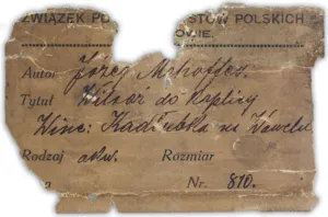 – na odwrocie na górnej listwie krosna centralnie nalepka Związku Powszechnego Artystów Polskich [druk, tusz]: ZWIĄZEK PO […] STÓW POLSKICH | [...]OWIE. | Autor Józef Mehoffer. | Tytuł Witraż do Kaplicy | Winc: Kadłubka na Wawelu | Rodzaj akw. Rozmiar | [...]a Nr. 810.;