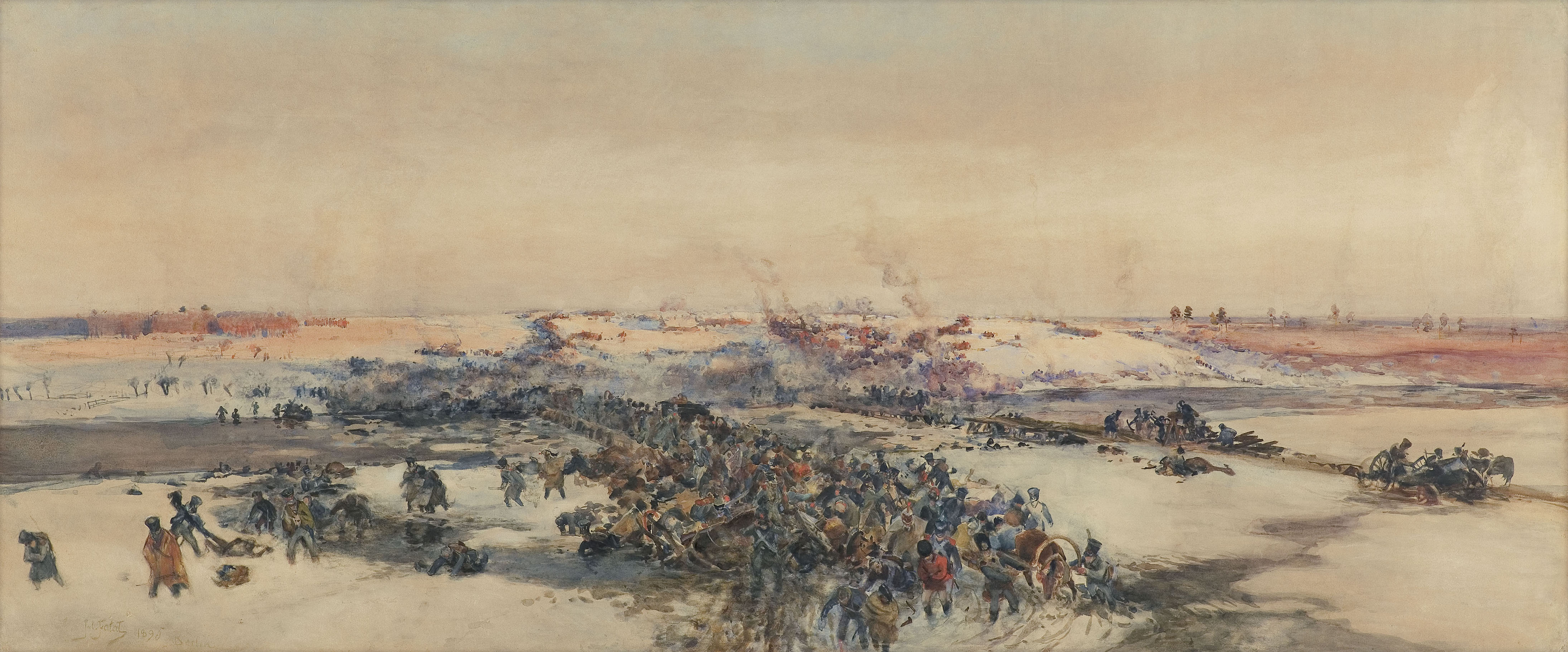 Julian Fałat (Tuligłowy [okręg lwowski] 1853 - Bystra k. Bielska 1929) - malarz i pedagog - jeden z najwybitniejszych artystów polskich okresu przełomu XIX i XX wieku, członek polskich i europejskich stowarzyszeń twórczych oraz Królewskiej Akademii Sztuk Pięknych w Berlinie, wielokrotnie odznaczany medalami na wystawach międzynarodowych. Studiował malarstwo u Władysława Łuszczkiewicza i Leona Dembowskiego w Szkole Sztuk Pięknych w Krakowie (1868-71 i 1881) i w Akademii Sztuk Pięknych w Monachium u Alexandra Strähubera i Johana Leonhardta Raaba (1877-80). Po studiach spędził kilka miesięcy w Rzymie, w 1884 był w Paryżu i w Hiszpanii, a w 1885 odbył podróż morską dookoła świata. W 1886 podczas polowania u ks. Radziwiłłów w Nieświeżu poznał późniejszego cesarza Niemiec Wilhelma II - dla którego następnie w latach 1886-95 pracował w Berlinie jako malarz nadworny. W latach 1894-96 współpracował z Wojciechem Kossakiem przy panoramie Berezyna. W 1895 został powołany na stanowisko dyrektora Szkoły Sztuk Pięknych w Krakowie, w której gruntownie zreformował system nauczania, przekształcając tę uczelnię w nowoczesną Akademię Sztuk Pięknych (r.1900). Do roku 1910 był rektorem Akademii; po przejściu na emeryturę osiadł w miejscowości Bystra k. Bielska. Znakomity akwarelista, malował także olejno. We wcześniejszym okresie tworzył w konwencji realistycznej, z czasem rozjaśnił i wzbogacił paletę, a w akwarelach wprowadzał rozlewną plamę barwną. Zasłynął jako malarz scen myśliwskich rozgrywających się najczęściej w zimowej scenerii; malował też pejzaże, wiejskie sceny rodzajowe, portrety, widoki miejskie.