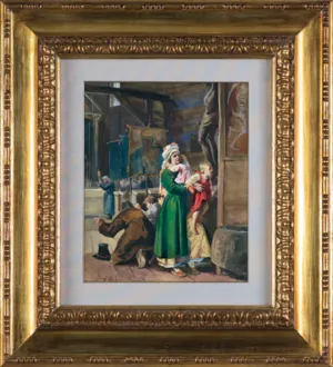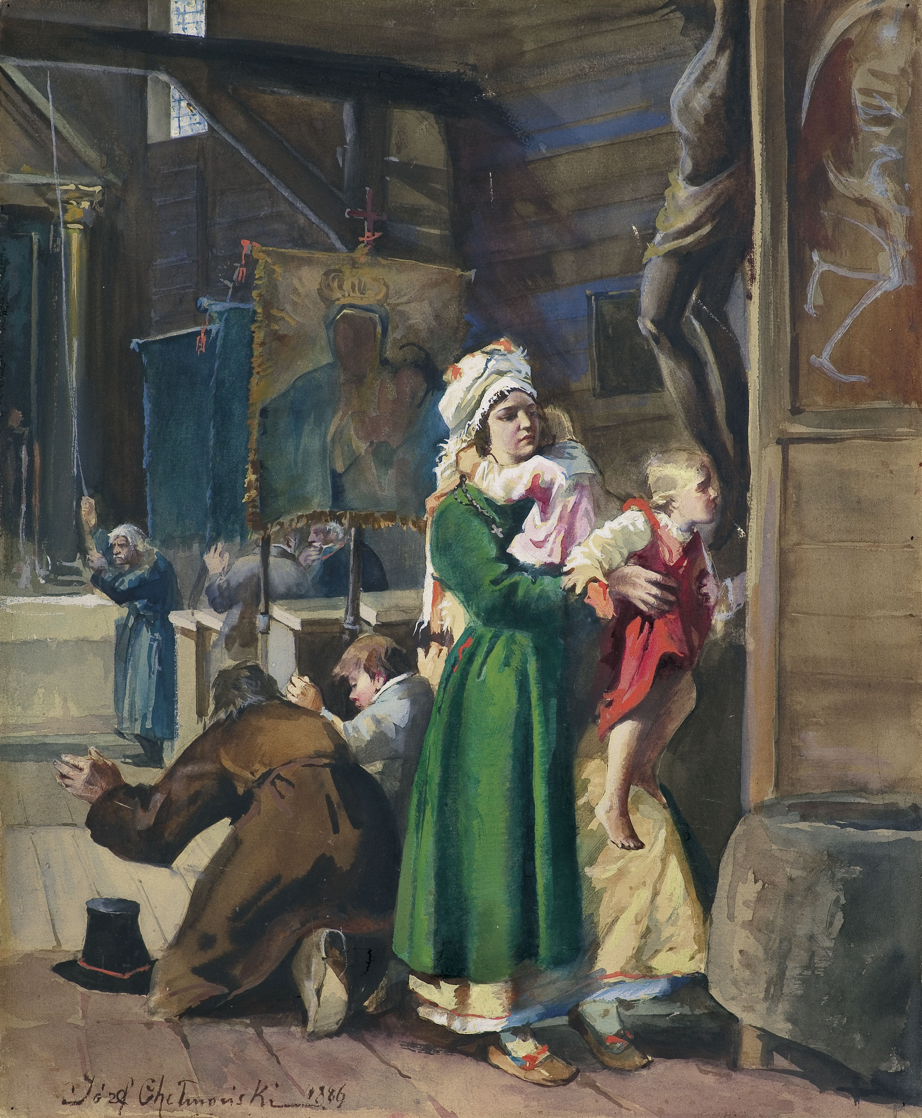 Dodatkowo świadczy o tym zamieszczenie aż dwóch drzeworytniczych reprodukcji w czołowych warszawskich czasopismach („Tygodnik Ilustrowany“ 1871, nr 199, s. 197, ryt. Julian Schübeler oraz „Kłosy“ 1871, nr 333, s. 309, ryt. Feliks Zabłocki). Niezwykle entuzjastycznie, o kompozycji z 1871 roku, napisał Wojciech Gerson, koryfeusz ówczesnego malarstwa polskiego: „W kościele“ przedstawia rodzinę wiejską, wchodzącą do skromnego drewnianego kościółka. Matka, trzymając za rękę niemowlę, starszą dziewczynkę podnosi, aby mogła ucałować nogi wyobrażenia ukrzyżowanego Zbawiciela. W głębi nieco ojciec klęczący pada krzyżem, obok niego zaś mały chłopczyna ten pobożny ruch ojca stara się naśladować. Reszta wnętrza kościoła zapełniona kilkoma jeszcze postaciami, między któremi wyborną charakterystyką odznacza się dziadek dzwoniący na nabożeństwo. Całość obrazu robi nader miłe, pełne prawdziwego religijnego uczucia a głębokie wrażenie; wszystko to znać z serca artysty wypłynęło. Rysunek postaci poprawny a energiczny, malowanie śmiałe i bez przesady, wskazuje iż autor tego obrazu chwyta prawdę z łatwością, a przelewa ją bez wielkiego trudu, czyli iż jest obdarzony rzeczywistą plastyczną zdolnością. Koloryt tego obrazu ma to w sobie zajmującego, że przy sile bardzo wielkiej, nie ma w nim czarności. Nawet same ściany drewniane, w naturze ciemne i brudne, tu zyskały na barwach i stanowią łącznie z szeregiem chorągwi zagłębienie, w którem brak zupełny uganiania się za teatralnym efektem dekoracyjnej głębokości wnętrza.