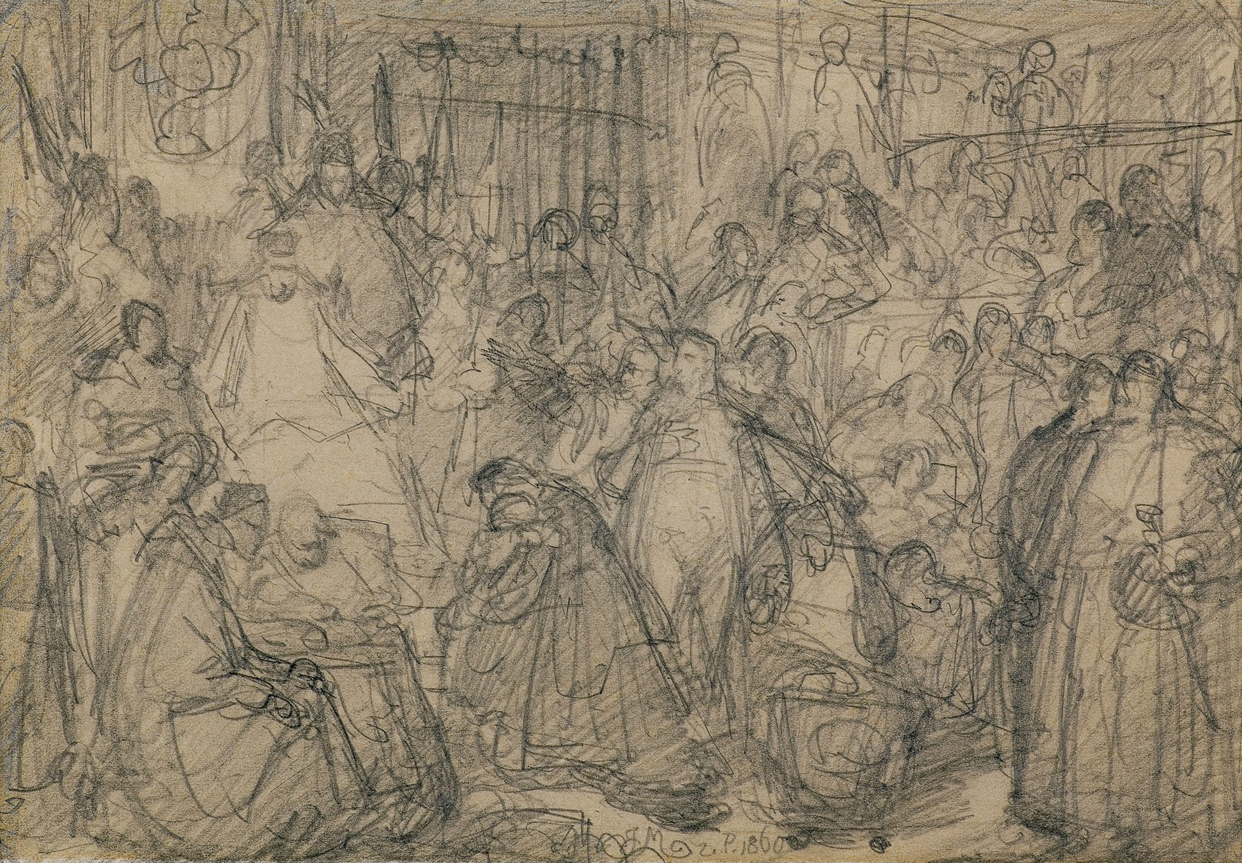 Jan Matejko (Kraków 1838 - Kraków 1893) - najwybitniejszy polski malarz historyczny; studia malarskie rozpoczął pod kierunkiem W. Łuszczkiewicza i W. K. Stattlera w krakowskiej Szkole Sztuk Pięknych (lata 1852-1858). Następnie uczył się w Akademii monachijskiej u H. Anschütza (1859) i przez dwa miesiące w Akademii wiedeńskiej u C. Rubena (1860). Po studiach mieszkał i pracował w Krakowie. W 1873 objął stanowisko dyrektora tamtejszej Szkoły Sztuk Pięknych, pełniąc tę funkcję aż do śmierci. Dużo podróżował - wielokrotnie wyjeżdżał do Paryża (w latach 1865-1880), Wiednia (1866-1888), w 1872 był w Konstantynopolu, a rok później w Pradze i Budapeszcie, odwiedzał również Włochy (1878-1879 i 1883). Był członkiem licznych akademii i towarzystw artystycznych m.in. Académie des Beaux-Arts (1873) i Instytutu Francuskiego (1874) w Paryżu, berlińskiej Akademii Sztuki (1874), Akademii Rafaelowskiej w Urbino (1878) i Künstlersgenossenschaft w Wiedniu (1888). W 1864 został członkiem Towarzystwa Naukowego w Krakowie, w 1887 otrzymał doktorat filozofii honoris causa Uniwersytetu Jagiellońskiego. Był twórcą wielkich i znanych płócien, m.in. Kazania Skargi, Rejtana, Unii Lubelskiej, Batorego pod Pskowem, Bitwy pod Grunwaldem, Hołdu Pruskiego czy Kościuszki pod Racławicami. Malował także portrety i - rzadziej - sceny religijne czy rodzajowe. Ważną rolę w jego twórczości odgrywał rysunek - artysta opracował, m.in. album Ubiory w Polsce od 1200 do 1795 oraz rysunkowy cykl Poczet królów i książąt polskich. W latach 1889-1891, wraz z zespołem uczniów, pracował nad polichromią kościoła Mariackiego w Krakowie. W rodzinnym domu malarza, przy ulicy Floriańskiej w Krakowie od 1898 mieści się poświęcone mu muzeum - Dom Matejki (Oddział MNK).