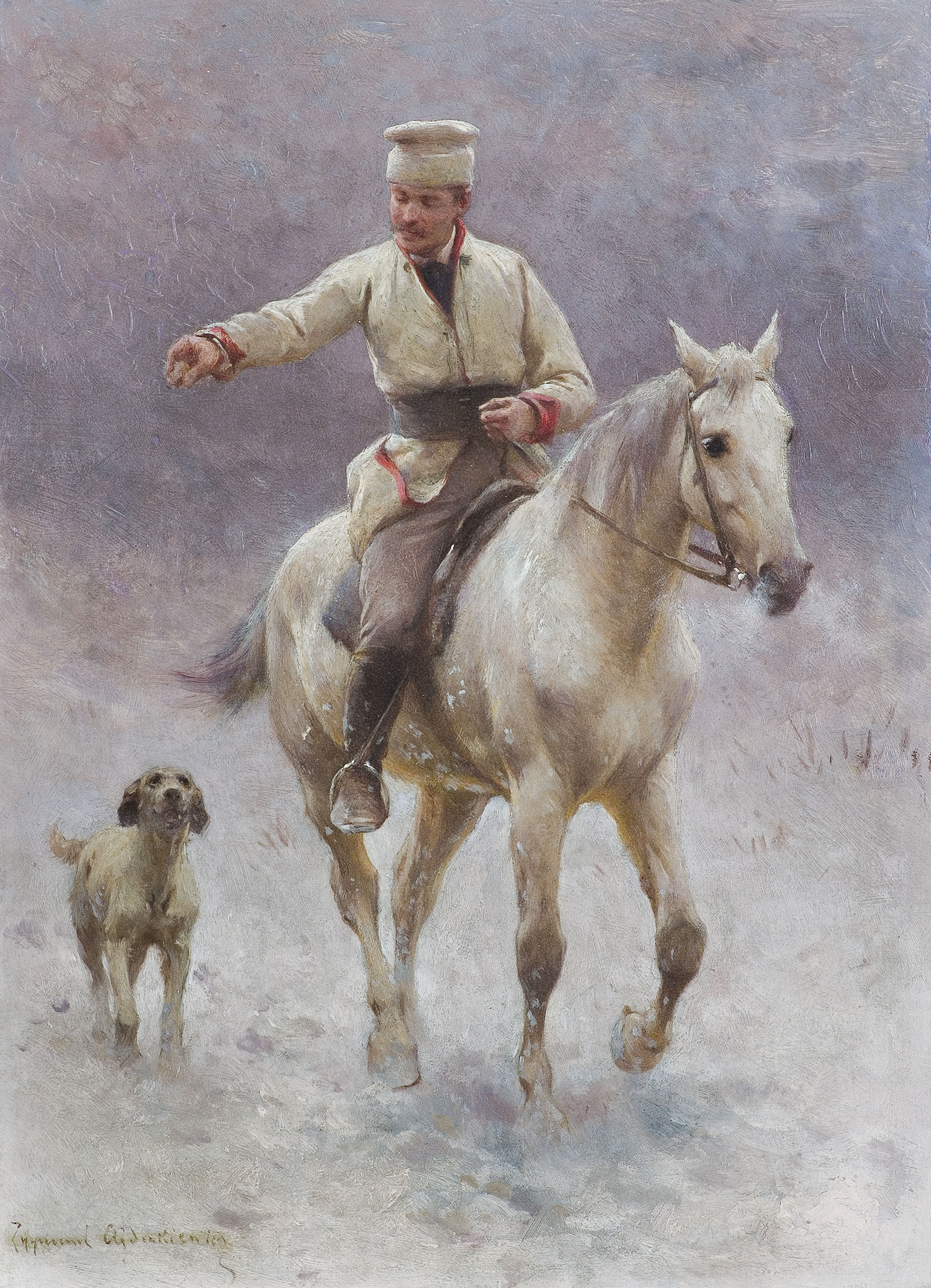 Zygmunt Ajdukiewicz (Witkowice pod Tarnobrzegiem 1861 - Wiedeń 1917) naukę malarstwa rozpoczął w Szkole Sztuk Pięknych w Krakowie. Następnie studiował w Akademii Sztuk Pięknych w Wiedniu (1880-1882) oraz w Akademii w Monachium (1883-1885), m.in. pod kierunkiem Johanna C. Hertericha. Po studiach stale mieszkał w Wiedniu, skąd w roku 1893 wyjeżdżał do Paryża. Podobnie jak jego stryjeczny brat, Tadeusz Ajdukiewicz, był malarzem sfer dworskich i arystokratycznych. Malował portrety, oraz obrazy historyczne i rodzajowe; sceny wojskowe, jarmarczne czy myśliwskie, w których odbijały się „pewne historyczno-stepowe zwyczaje z kresów dawnej Polski”. Przez współczesnego recenzenta określony jako „koniarz - pejzażysta”, miał „dużo pomysłów szerokich i nader wdzięcznych”. Dla pałacu cesarskiego w Wiedniu wykonał serię obrazów ilustrujących historię Złotego Runa, a w 1891 namalował cykl 12 obrazów ze scenami z życia Tadeusza Kościuszki (w 1892 wydany jako album przez F. Bondy’ego w Wiedniu). Zajmował się także ilustracją książkową; m.in. ilustrował Potop Sienkiewicza. Wystawiał od 1882; w TPSP w Krakowie, w TZSP i Salonie Krywulta w Warszawie, we Lwowie, w Wiedniu, Berlinie, Monachium, Pradze. Jego obrazy wyróżniane były medalami, m.in. w 1891 wielkim złotym medalem na wystawie w Wiedniu i złotym medalem II klasy w Berlinie, w !898 złotym medalem II klasy w Wiedniu, w 1894 medalem srebrnym we Lwowie. Dziś prace artysty znajdują się w zbiorach licznych muzeów polskich, m.in. w Muzeach Narodowych Warszawy, Krakowa i Wrocławia, w Państwowych Zbiorach Sztuki na Wawelu czy w Muzeum Górnośląskim w Bytomiu.
