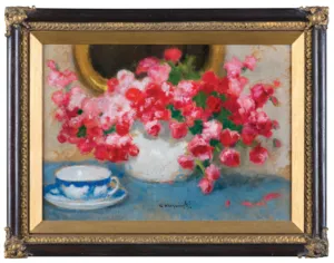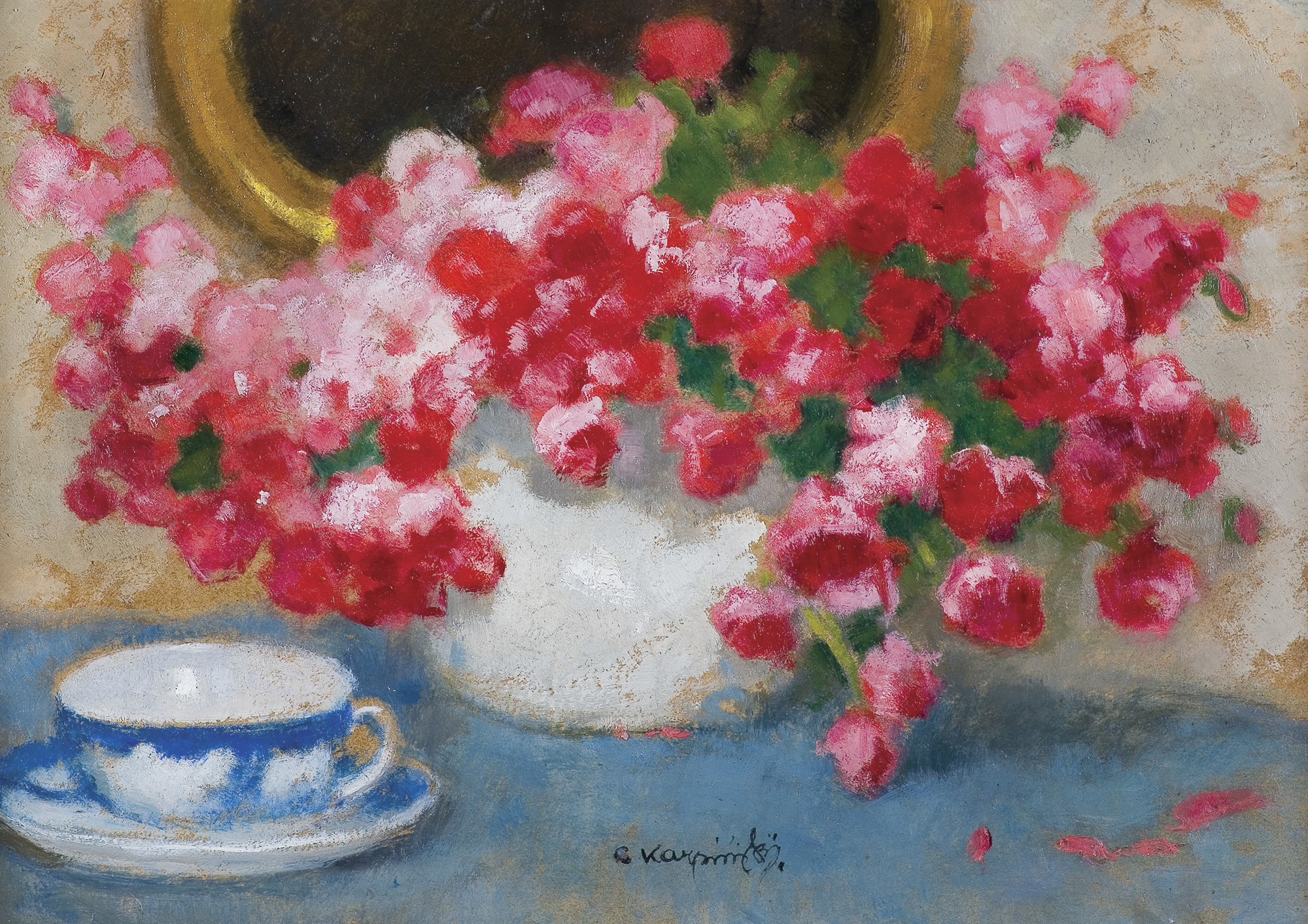 Alfons Karpiński (Rozwadów, dziś dzielnica Stalowej Woli 1875 - Kraków 1961) w latach 1891-1899 studiował w krakowskiej Szkole Sztuk Pięknych pod kierunkiem Floriana Cynka, Izydora Jabłońskiego, Władysława Łuszczkiewicza i Leona Wyczółkowskiego, a następnie kształcił się jeszcze u Antona Ažbégo w Monachium (1903), u Kazimierza Pochwalskiego w Wiedniu, a od 1907 także w Paryżu. Podróżował do Włoch i Londynu. Stale mieszkał w Krakowie; związany z tamtejszym środowiskiem skupionym wokół „Zielonego Balonika” projektował dekoracje do przedstawień kabaretu. Należał do Tow. Artystów Polskich „Sztuka”, grupy „Zero”, był członkiem wiedeńskiego stowarzyszenia „Secesja” i krakowskiego TPSP. Uczestniczył w wielu wystawach w kraju i za granicą. W czasie I wojny światowej służył w armii austriackiej. Na bogatą twórczość artysty składają się wczesne sceny rodzajowe z podkrakowskiej wsi, pejzaże i portrety, wśród nich zwłaszcza portrety kobiece, które przyniosły mu szczególną popularność. Z czasem głównym – obok portretu – tematem jego obrazów stały się martwe natury z kwiatami, dekoracyjne kompozycje o stonowanej gamie barwnej. Artysta zajmował się także grafiką i ilustratorstwem.