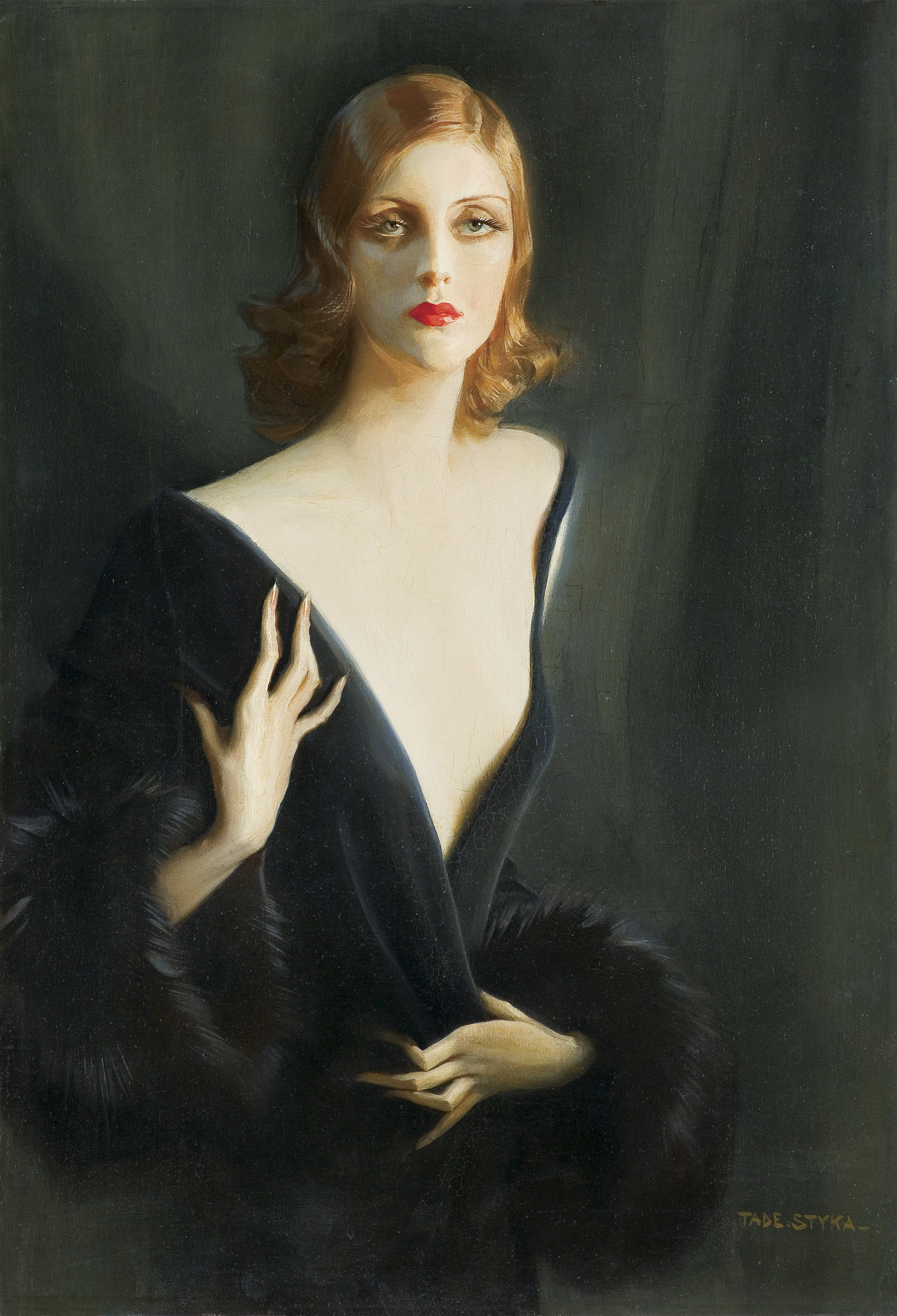 Jayne Manners, amerykańska aktorka broadwayowska, urodzona jako Jane Oppermann w 1908 roku. W 1925 roku przeniosła się z rodzinnej Georgii do Nowego Jorku. Z Tadeuszem Styką zapewne poznali się ok. 1929 roku, kiedy to artysta zamieszkał w samym centrum Manhattanu. O ich bliskiej relacji świadczą liczne akty aktorki wykonane przez Stykę. Prezentowany portret ukazuje piękną, młodą femme fatale z niezwykle długimi i smukłymi palcami. Sportretowana kobieta ubrana jest jedynie w czarny płaszcz, który podkreśla alabastrowy kolor jej skóry. Głęboki dekolt delikatnie podkreśla linię piersi, a smukłe dłonie wyłaniają się z futrzanych rękawów. Usta podkreślone czerwoną szminką i gładko uczesane włosy dodają modelce drapieżności. Sportretowana Jayne Manners, jak na filmową kusicielkę przystało, ma delikatnie przymknięte oczy, co nadaje jej przedstawieniu zmysłowości i pobudza wyobraźnię widza. Artysta, w charakterystyczny dla siebie sposób, znakomicie utrwalił wizerunek młodej kobiety, która rozkoszuje się świeżo zdobytą niezależnością i sławą.