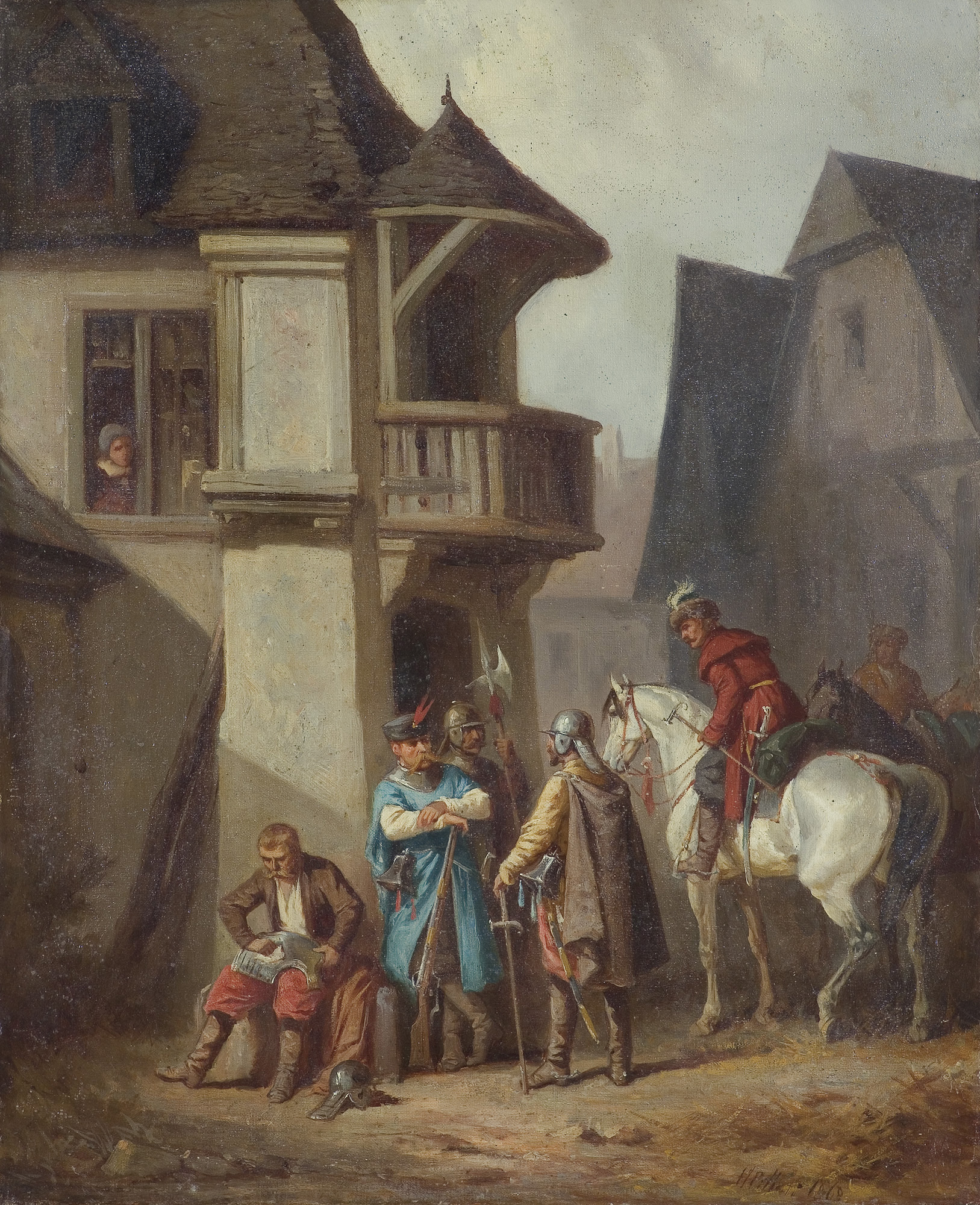 Henryk Pillati (Warszawa 1832 - Warszawa 1894) pochodził z rodziny inteligenckiej; jego młodszy brat Ksawery (1843-1902) był również malarzem. Studia artystyczne rozpoczął w 1845 w warszawskiej Szkole Sztuk Pięknych, jednak w 1848, wobec konieczności zarobkowania musiał przerwać naukę. Zajął się wówczas ilustratorstwem oraz malowaniem obrazów rodzajowo-historycznych. Od 1852 malował też obrazy do dekoracji wiślanych statków pasażerskich. Należał wówczas go grupy młodych artystów, "cyganerii" skupionej wokół Marcina Olszyńskiego. Dzięki prywatnym stypendiom w latach 1853/54 i 1857/58 dwukrotnie był w Paryżu, gdzie uczęszczał do École des Beaux-Arts oraz kopiował obrazy w muzeach. Wyjeżdżał do Włoch i Monachium, gdzie podobno studiował w Akademii. Od 1858 stale przebywał w Warszawie. Swoje obrazy wielokrotnie wystawiał w Towarzystwie Zachęty Sztuk Pięknych i w Salonie Krywulta w Warszawie oraz w Towarzystwie Przyjaciół Sztuk Pięknych w Krakowie. Jako ilustrator współpracował z czasopismami warszawskimi, głównie z "Tygodnikiem Ilustrowanym" i "Kłosami". Ilustrował też wydawnictwa książkowe, m.in. Pisma J. I. Kraszewskiego, Pisma A. Mickiewicza, Bajki i powiastki S. Jachowicza, Śpiewy historyczne J. U. Niemcewicza (razem z Juliuszem Kossakiem). W roku 1879 wyjechał do Petersburga, by objąć posadę w tamtejszym wydawnictwie. Jednak pogłębiająca się choroba alkoholowa tak dalece nadwerężyła jego siły i zdrowie, że wkrótce brat Ksawery musiał zabrać go z powrotem do Warszawy. Chory i zniedołężniały, spędził ostatnie lata w przytułku Towarzystwa Dobroczynności. Losy artysty, który ulegając nałogowi zaprzepaścił swój wielki talent, opisał Wiktor Gomulicki w noweli Malaria. Pillati malował głównie, dość konwencjonalne, ale pełne życia sceny historyczne i batalistyczne; szczególnie chętnie walki i potyczki konne ze Szwedami. Malował też obrazy rodzajowe, odznaczające się humorem i zmysłem obserwacji typów, gestów i zachowań ludzkich. Miał wielkie poczucie koloru, ale swoje obrazy traktował dość szkicowo, malując przeważnie w oparciu o pamięć i wyobraźnię. Lekkością i swobodą wyróżniają się rysunki artysty; wiele z nich przedstawia osoby i epizody z życia "cyganerii" warszawskiej.