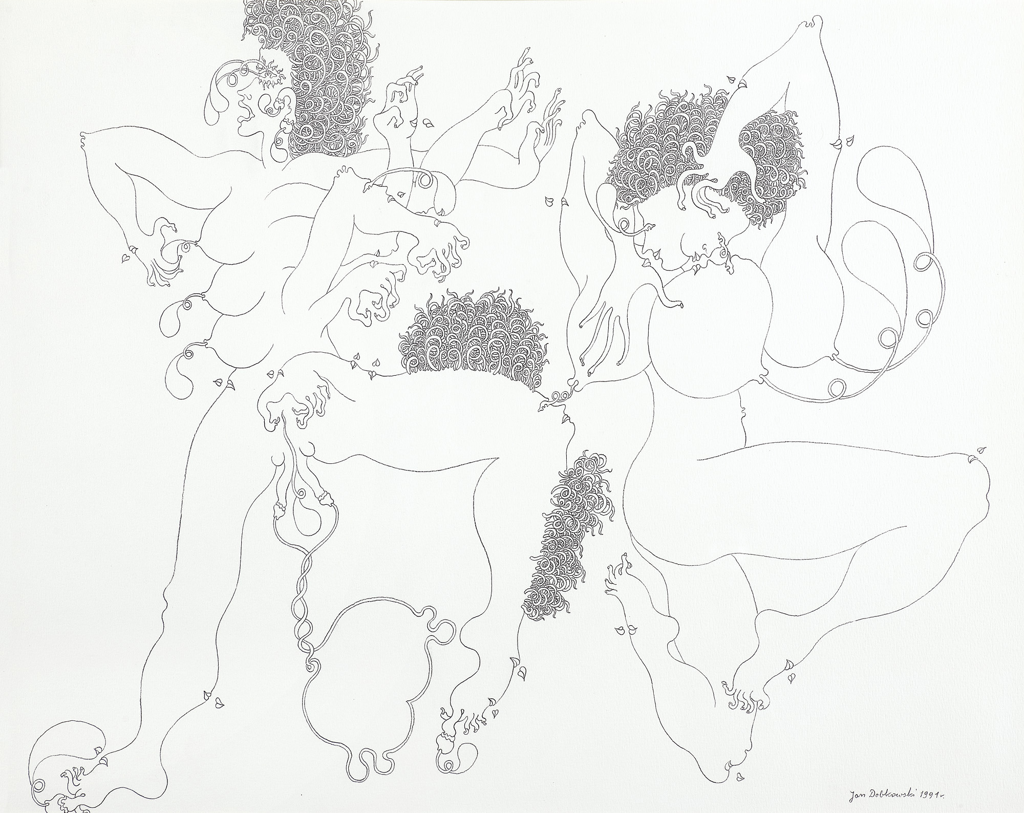 Jan Dobkowski (Łomża 1942, mieszka w Warszawie) studiował w latach 1962-1968 na Wydziale Malarstwa warszawskiej ASP pod kierunkiem prof. Juliusza Studnickiego i Jana Cybisa. Będąc jeszcze na studiach, w 1966, utworzył duet artystyczny, w którym jego partnerem był Jerzy (Jurry) Zieliński. Ich pierwsza wspólna wystawa pn. Neo-Neo-Neo odbyła się w Warszawie w 1967. Wystawiali wspólnie do 1970. W 1968 powstały pierwsze zielono-czerwone obrazy Dobkowskiego (używającego w tym czasie pseudonimu Dobson). W pracach tych, operujących giętkimi, falistymi liniami, w których upatrywano wpływów secesji, artysta używał sposobów rodem z op-artu dla wywołania złudzeń optycznych (wirowanie, mżenie, pozorny ruch form). Równolegle z obrazami tworzył też formy z płyt i folii do montowania w przestrzeni. Złoty medal na Sympozjum Złotego Grona w Zielonej Górze w 1971 i blisko roczny pobyt w USA na stypendium Fundacji Kościuszkowskiej w 1972 to kolejne etapy pełnej sukcesów kariery malarza. Wyraźną zmianę nastroju i wymowy jego prac przyniosły wydarzenia 1980-1981 roku, zwłaszcza wprowadzenie stanu wojennego. Monochromatyczne, ciemne płótna znaczył wtedy nikłymi, wiotkimi liniami rysunku. Najczęstszym motywem były patriotyczne i religijne symbole, dopowiadane tytułami nawiązującymi do realiów czasu. Kolejna radykalna zmiana nastąpiła ok. 1990. Symbolicznym zwiastunem nowego okresu stał się olbrzymi, radosny, eksplodujący bogactwem barw, kształtów i ruchu obraz ...a życie sobie płynie... (394 x 588 cm) z 1990-1991. Podobne cechy formalne charakteryzują twórczość artysty w całej dekadzie lat 90. Równolegle z malarstwem Dobkowski pracuje nad rysunkiem, będącym bardzo ważnym dopełnieniem jego twórczości.