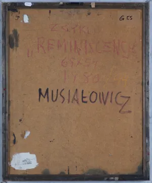 Henryk Musiałowicz (Gniezno 5 I 1914 - Warszawa 24 II 2015) od 1930 uczył się w Państwowej Szkole Sztuk Zdobniczych i Przemysłu Artystycznego w Poznaniu. W 1936 uzyskał absolutorium na Wydziale Malarstwa Dekoracyjnego i Witrażownictwa. W 1937 podjął studia malarskie w warszawskiej ASP pod kierunkiem Felicjana Kowarskiego i Leonarda Pękalskiego (dyplom pod kierunkiem tego pierwszego uzyskał w 1947). Lata okupacji spędził w Warszawie, kontynuując twórczość artystyczną (wykonywał w tym czasie m.in. ekslibrisy). Współpracował z Departamentem Informacji Delegatury Rządu na Kraj. Od 1940 związany był z grupą absolwentów warszawskiej uczelni, działającą w latach okupacji w tzw. Bacciarellówce na terenie Zamku Królewskiego, a po wojnie znaną jako grupa „Warszawa“. W sztuce Musiałowicza, zwłaszcza bezpośrednio po wojnie, silnie zaznaczyły się wątki związane z martyrologią, tragedią Powstania Warszawskiego, zburzeniem Warszawy, której ruiny upamiętnił w cyklu rysunków z 1945-1946. Poszukując formy odpowiedniej dla przeżyć wojennych, znalazł ją w sztuce Holendrów, zwłaszcza Rembrandta, którego twórczość poznał podczas podróży w 1956. Odtąd na stałe zdominował jego malarstwo ciemny koloryt, uspokojona, niekiedy hieratyczna kompozycja form zaledwie sugerujących figury ludzkie, bogata faktura i połyskliwość powierzchni. Z czasem artysta zaczął konstruować formy przestrzenne z drewna, jak zwykle pokrytego bogatą warstwą malarską, w wydłużonych stojących kształtach. Musiałowicz do 1983 aktywnie działał w ZPAP. Był członkiem międzynarodowych organizacji artystycznych, w tym kilku włoskich, jak Accademia Tibertina w Rzymie (od 1965), Accademia Italiana delle Arti e del Lavoro w Parmie (od 1979), Accademia Europea, Calvatone (od 1985). W 2002 wielką retrospektywę jego twórczości zorganizowało Muzeum Narodowe w Poznaniu.