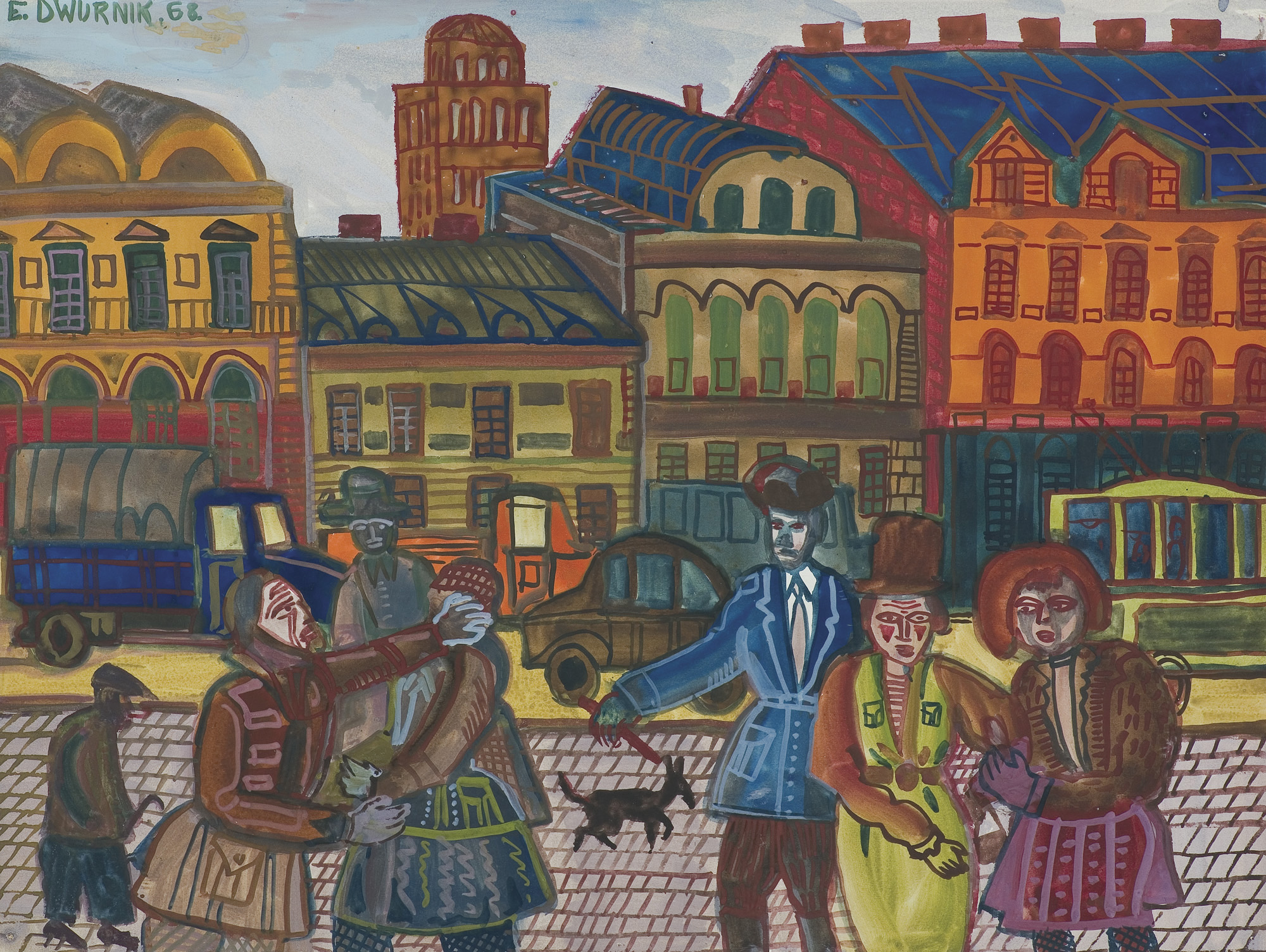 Edward Dwurnik (Radzymin 19 IV 1943 - Warszawa 28 X 2018) studiował malarstwo w ASP w Warszawie (1963-1970), jednak jako swego „mistrza“ wymienia Nikifora. Jego to prace, zobaczone po raz pierwszy w 1965, zainspirowały ówczesnego studenta III roku do narysowania pierwszych prac z cyklu „Podróże autostopem“, które kontynuował w nastepnych latach. W 1972-1978 powstawał cykl „Sportowcy“, w którym portretowane były, dodajmy - kąśliwie, typowe postaci z lat 70. Równolegle od 1975 powstawał cykl „Robotnicy“, który kulminował w okresie „Solidarności“ 1980-1981. Za prace z tego cyklu Dwurnik otrzymał w 1981 Nagrodę Krytyki Artystycznej im. Cypriana Kamila Norwida, natomiast za obrazy z cyklu „Warszawa“ (1981), proroczo zapowiadające stan wojenny - Nagrodę Kulturalną „Solidarności“ podziemnej w 1983. W latach 80. malarstwo Dwurnika przybrało wyraz ekspresyjny i dramatyczny. Powstające w tej dekadzie obrazy miały niejednokrotnie wymowę polityczną, przybierały też kostium historyczny, tak czy inaczej odnoszący się do współczesnych spraw i realiów. Cykl „Droga na Wschód“ (1989-91) upamiętniał ofiary stalinizmu, natomiast cykl „Od Grudnia do Czerwca“ (1990-94) - ofiary stanu wojennego. Zarówno ideowe, jak i czysto malarskie walory tych prac przyniosły artyście ogromne uznanie, zarówno w kraju jak i za granicą. Jego wyrazem była prestiżowa nagroda Fundacji Coutts & Co w Zurychu (1992). W latach 90. powstają cykle będące kontynuacją „Podróży autostopem“: „Niebieskie miasta“ (od 1993) i „Diagonale“ (od 1996), jak również kompozycje nowego typu, jak widoki morskie (cykl „Błękitne“, 1992-93) czy cykl „Wyliczanka“ (1996-99). Artysta wiele wystawia, miał ok. 100 wystaw indywidualnych w Polsce i za granicą, brał też udział w licznych wystawach i festiwalach krajowych i międzynarodowych, m.in.: X Biennale Sztuki Współczesnej, Menton 1974, Documenta 7, Kassel 1982, 5th Biennale, Sydney 1985, XIX Biennale Sztuki, Sao Paulo 1987; Olimpiada Sztuki, Seul 1988. Równolegle z malarstwem uprawiał rysunek, collage, grafikę warsztatową (litografia, techniki metalowe, kserografia, stemple) i użytkową (ilustracja, plakaty do własnych wystaw indywidualnych).