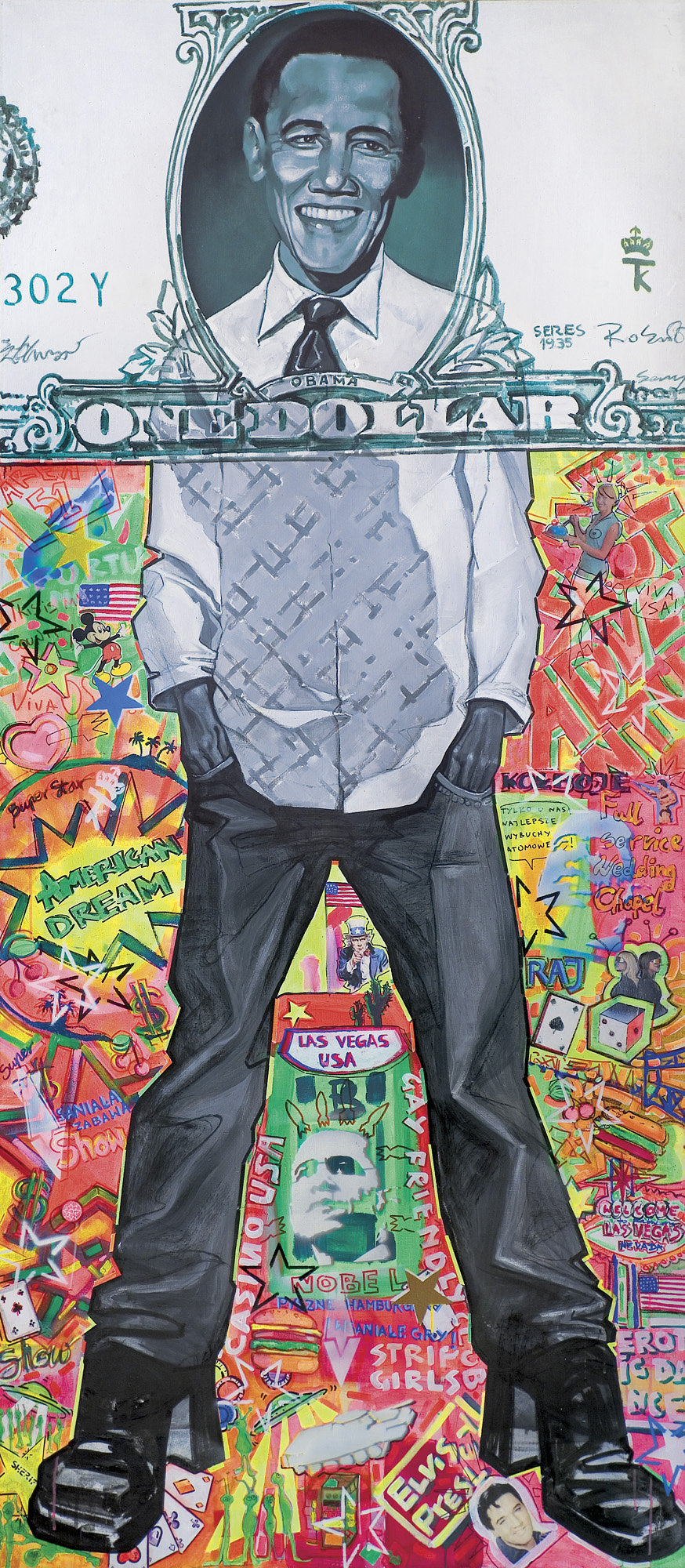 sygn. na odwr. na płótnie czarną farbą l.g.: The Krasnals | Brothers in arm | Last Supper 2009 | „Representative of national minorites“, poniżej: „BARACK OBAMA w | LAS VEGAS / AFERA | hazardowa/“ 2009 | Whielki Krasnal, po p. znak grupy artystycznej: TK pod koroną (niebieski)