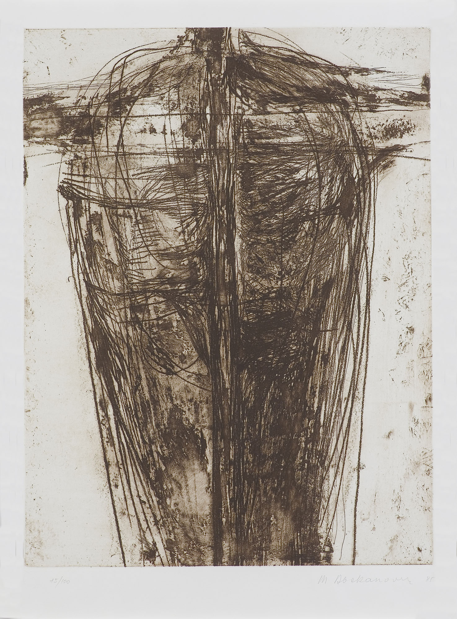 Magdalena Abakanowicz (Falenty k. Warszawy 20 VI 1930 - Warszawa 20. IV 2017) studiowała w Gdańsku (1949-1950) i w warszawskiej ASP (1950-1954). Wykładała w PWSSP w Poznaniu (1965-1990). Od pocz. lat 60. zajmowała się tkaniną unikatową, tworząc autorskie formy przestrzenne, nazwane od jej nazwiska „abakanami“. W 1965 zdobyła Złoty Medal na II Międzynarodowym Biennale Tkaniny w Sao Paulo. W latach 70. zaczęła tworzyć cykle figuralne z juty utwardzanej żywicą: „Alteracje“ (od 1974), „Plecy“ (1976-80), „Embriologia“ (1978-80), "Tłumy" (od 1986). Od lat 80. artystka uprawia rzeźbę plenerową, używając drewna, gliny, kamienia i odlewów (grupy „Tłum“, „Katharsis“ w prywatnej kolekcji we Włoszech, „Negev“ - 7 kolosalnych kamiennych kół w parku Israel Museum w Jerozolimie). W 1987 zaczęła pracę nad „Grami wojennymi“, wielkimi formami przypominającymi pociski, konstruowanymi z naturalnego drewna i żelaza. Od 1991 rozwija koncepcję „architektury arborealnej“, pierwotnie projektowanej jako przedłużenie osi La Defense w Paryżu, którą propaguje jako rozwiązanie problemów wielkich aglomeracji. Uczestniczyła w najważniejszych przeglądach sztuki współczesnej, jak Biennale w Sao Paulo (1965, 1979), Biennale w Wenecji (1968, 1980) i in. Jest laureatką wielu polskich i zagranicznych nagród.