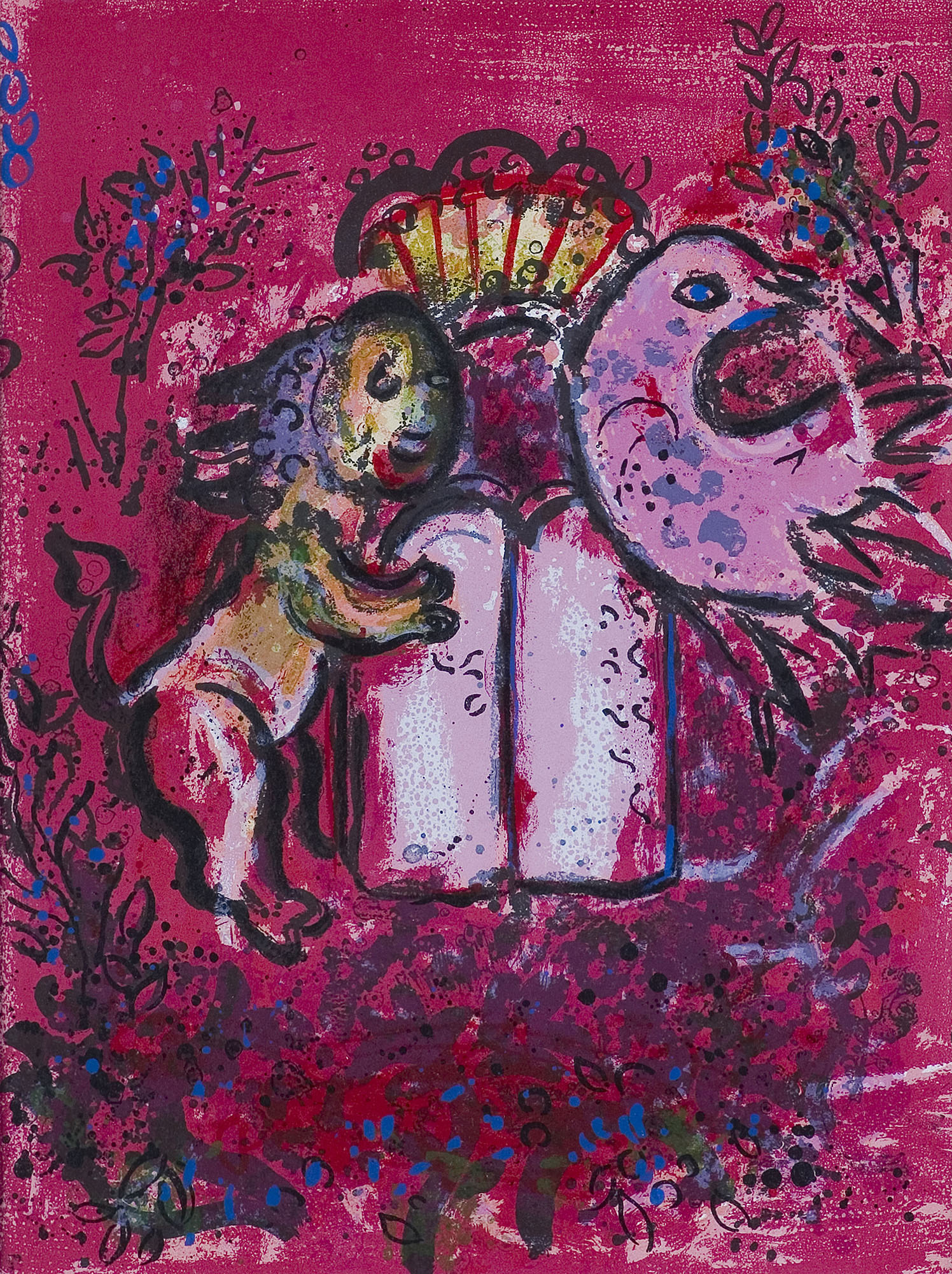 Marc Chagall uczył się rysunku u witebskiego malarza nazwiskiem Juda Pen, następnie od 1907 studiował w Akademii petersburskiej. W 1910 wyjechał na stypendium do Paryża. Zamieszkał w La Ruche na Montparnassie, wszedł do kręgu artystów, wśród których byli m.in. Modigliani, Soutine, Delaunay. W 1914 wrócił do Witebska, w 1915 poślubił Bellę (zm. 1944), muzę i bohaterkę wielu obrazów. W latach 1915-1917 mieszkał w Sankt Petersburgu, gdzie zastała go rewolucja. Mianowany komisarzem sztuk pięknych na obszar Witebska, założył tam i prowadził w latach 1918-1919 szkołę artystyczną, której profesorami byli m.in. Kazimierz Malewicz i El Lissitzky. W 1919 przeniósł się do Moskwy, gdzie do 1922 był kierownikiem artystycznym Państwowego Teatru Żydowskiego. W 1923 ostatecznie opuścił Rosję, osiedlając się w Paryżu. We Francji spędził resztę życia, z przerwą w latach 1941-1947, kiedy to schronił się w Nowym Jorku. Jego styl, wykształcony w młodości niezależnie od równoległych kierunków w sztuce, pozostał w ciągu życia artysty mało zmieniony. Wyobraźnia i sposób obrazowania Chagalla, zbliżone do sztuki naiwnej, wpisały się najsilniej w nurt surrealizmu, stając się jego znaczącym rozszerzeniem. Chagall łączył poetyckość i cudowność swych fantazji z rozwiniętym warsztatem malarza-kolorysty. Był też utalentowanym i płodnym grafikiem (cykle ilustracji do "Martwych dusz" Gogola, 1923-1927, "Bajek" La Fontaine’a, 1927-1930, Biblii, 1931-1955 – każdy cykl liczył ponad 100 plansz w technikach metalowych). Zajmował się scenografią (projekty dla Metropolitan Opera w Nowym Jorku, 1945, Opery w Paryżu, 1958), malarstwem monumentalnym (plafon w Operze paryskiej, 1963-1964), projektował witraże, dekoracje ceramiczne.