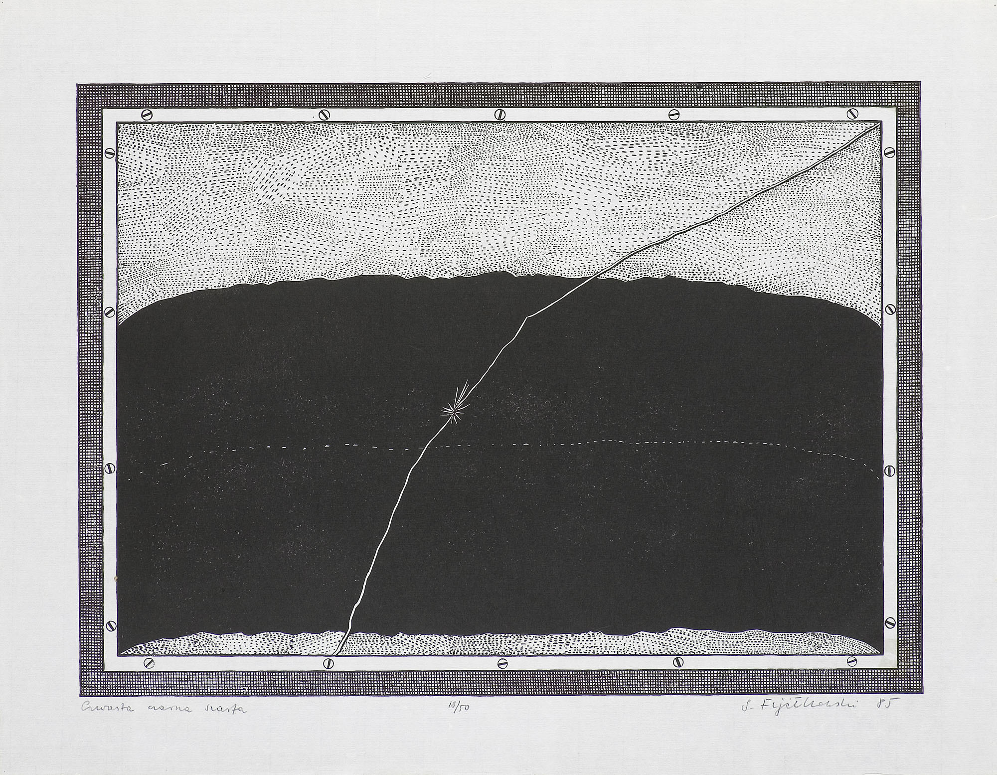 Stanisław Fijałkowski (Zdołbunow na Wołyniu 1922 - Łódź 2020) w latach 1944-1945 przebywał na robotach przymusowych w Królewcu. W latach 1946- 1951 studiował w Państwowej Wyższej Szkole Sztuk Plastycznych w Łodzi pod kierunkiem Władysława Strzemińskiego, Stefana Wegnera i Ludwika Tyrowicza, u którego uzyskał dyplom. W latach 1947-1993 był pedagogiem w macierzystej uczelni, od 1983 profesorem. Pełnił funkcje prorektora i dziekana Wydziału Grafiki. Wykładał też za granicą: w Mons (1978, 1982), Giessen (1989-1990), Marburgu (1990). Jest wiceprezydentem Międzynarodowego Stowarzyszenia Drzeworytników XYLON w Szwajcarii i przewodniczącym Polskiej Sekcji tej organizacji. Należy do zagranicznych Akademii nauk i sztuk w Salzburgu i Brukseli. Jest laureatem Nagrody Krytyki Artystycznej im. Cypriana Norwida 1971, Nagrody im. Jana Cybisa 1990 i wielu innych wyróżnień. Jako pierwszy w Polsce przetłumaczył teksty Wasyla Kandinskiego („Punkt i linia a płaszczyzna” i „O duchowości w sztuce”), oba wydane drukiem, oraz Kazimierza Malewicza „Świat bezprzedmiotowy”. Malarstwo Fijałkowskiego bazuje na skromnym zasobie abstrakcyjnych znaków i ograniczonej gamie barwnej. Kompozycje, w większości sugerujące ujęcia pejzażowe czy szerzej – przestrzenne, budowane są jakby pojedynczymi dotknięciami pędzla. Każdy szczegół nabiera ważności, śledzi się każdy niuans barwy czy faktury. Charakterystyczne kształty i motywy powtarzają się w różnych konfiguracjach w pracach artysty niczym wyrazy, z których układa za każdym razem inną opowieść. Obrazy noszą zazwyczaj poetyckie tytuły, często wpadające w tony groteskowe czy surealistyczne. Cechy te składają się na niezwykłe, intrygujące, autonomiczne zjawisko artystyczne. Malarstwu Fijałkowskiego od początku lat 60. towarzyszy czarno-biała grafika, głównie linoryt i drzeworyt, sporadycznie litografia.
