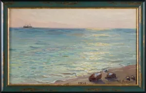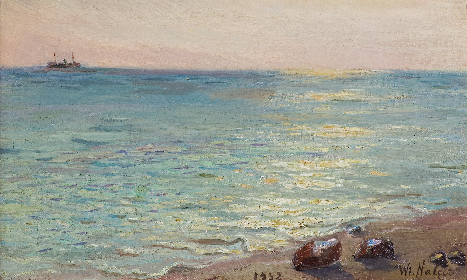Włodzimierz Nałęcz (Kijów 1865 - Jeruzal k. Skierniewic 1946) studia malarskie w Akademii Sztuk Pięknych w Petersburgu rozpoczął w roku 1885. Kształcił się pod kierunkiem Iwana Ajwazowskiego i Lwa Lagorio. Wyjeżdżał na stypendia do Belgii, Szwecji oraz Norwegii, gdzie malował pod kierunkiem Adelsteena Normanna i Hansa Dahla. Naukę uzupełniał też w Akademii w Düsseldorfie i w Anglii. W 1893 powrócił do Petersburga i ukończył studia z tytułem „kłassnyj chudożnik“ i małym medalem srebrnym. Następnie, do 1899 przebywał w Paryżu. Nałęcz był przede wszystkim pejzażystą. W poszukiwaniu wciąż nowych motywów i inspiracji wyjeżdżał w liczne podróże, malując krajobrazy z wybrzeży Bretanii, Anglii, Szkocji, Skandynawii czy Krymu. Od 1907 stale mieszkał w Warszawie, gdzie był nauczycielem rysunku w Gimnazjum Górskiego. Po zakończeniu I wojny światowej, jako jeden z pierwszych polskich pejzażystów, malował wybrzeża Bałtyku, angażując się w propagowanie polityki morskiej Polski. Od roku 1920 prowadził letnie kursy pejzażu w swojej pracowni w Lisim Jarze koło Rozewia, a w 1922 założył Koło Marynistów Polskich i był jego długoletnim prezesem. Był także literatem; pisywał artykuły z zakresu sztuki oraz marynistyki. Wydał też kilka książek ilustrowanych własnymi rysunkami; wśród "Moje wędrówki artystyczne" (1914), "Na bursztynowym szlaku" (1926), "Album morski" (1930) - wspomnienia ze swych licznych i ciekawych podróży. Był kierownikiem artystycznym czasopisma „Bandera polska“ oraz współtwórcą miesięcznika „Morze“.