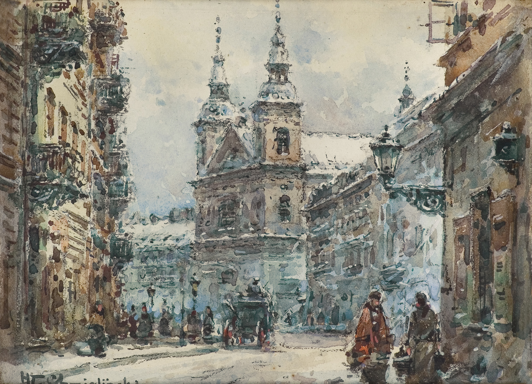 Władysław Chmieliński (Warszawa 1911 - Warszawa 1979) był malarzem związanym z Warszawą, gdzie stale mieszkał i pracował. W latach 1926-1931 studiował w warszawskiej Miejskiej Szkole Sztuk Zdobniczych i Malarstwa (dawna Klasa Rysunkowa). Wiodącym tematem jego obrazów były widoki miejskie, malowane olejno i akwarelą. W latach 1935-1938 stworzył cykl akwarel przedstawiających obiekty polskiej architektury; wśród nich, widoki Sandomierza, Krakowa, Kazimierza nad Wisłą, a także wnętrza zabytkowych kościołów czy pałaców, m.in. Zamku Królewskiego w Warszawie i Pałacu w Wilanowie. Malował także pejzaże i wiejskie sceny rodzajowe – kuligi, sanny, zaprzęgi, wesela, konie na tle krajobrazu. W latach 1967-1969 wyjeżdżał na dłuższe pobyty do Danii. W latach 1936-1939 artysta używał także pseudonimu „Władysław Stachowicz”.