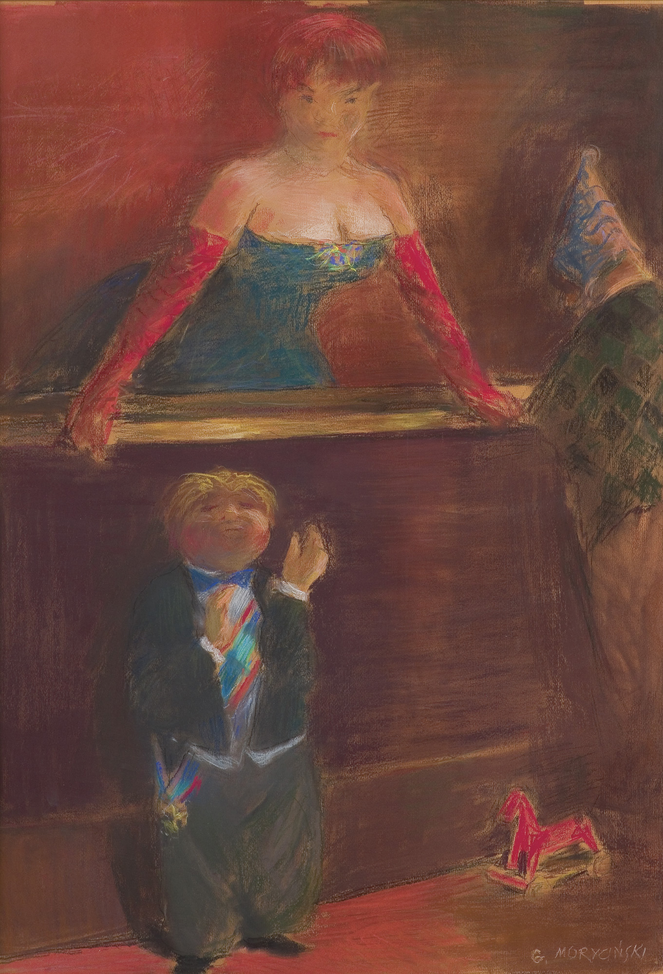 Grzegorz Moryciński (Augustów 1936 - Warszawa 2015) - studiował na Wydziale Malarstwa ASP w Warszawie pod kierunkiem profesorów Stanisława Szczepańskiego i Artura Nachta-Samborskiego, uzyskując dyplom u tego drugiego w 1961. Zajmował się malarstwem, rysunkiem, grafiką warsztatową (akwaforta, linoryt) i użytkową (plakat, grafika książkowa). Tworzył figuralne kompozycje, których forma wiele zawdzięcza tradycji kolorystycznej, w jakiej artysta został wykształcony. Pierwszą wystawę indywidualną miał w 1960; odtąd wielokrotnie wystawiał w kraju i za granicą. W okresie stanu wojennego uczestniczył w ruchu kultury niezależnej, wiele wystawiając w kościołach oraz na pokazach prywatnych (wystawa w pracowni Marii Anto, wspólnie z Jarosławem Modzelewskim, Warszawa 1983, wystawa zbiorowa w pracowni Urszuli Brzozowskiej-Strałeckiej, Warszawa 1984). Był też związany z kręgiem parafii Miłosierdzia Bożego na Żytniej. Zdobył liczne nagrody, m. in. wyróżnienia w Konkursie im. Jana Spychalskiego w 1973 i 1977, Nagrodę Stołecznej Rady Narodowej w 1968, nagrodę na wystawie „Bielska Jesień” w 1979, Nagrodę Komitetu Kultury Niezależnej „Solidarność” w 1988. W 1993 był stypendystą Fundacji Pollock-Krasner. Jego prace znajdują się w czołowych kolekcjach muzealnych w kraju oraz w wielu prywatnych w Polsce i za granicą.