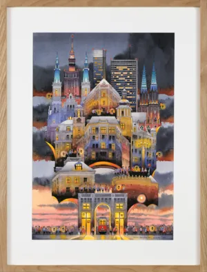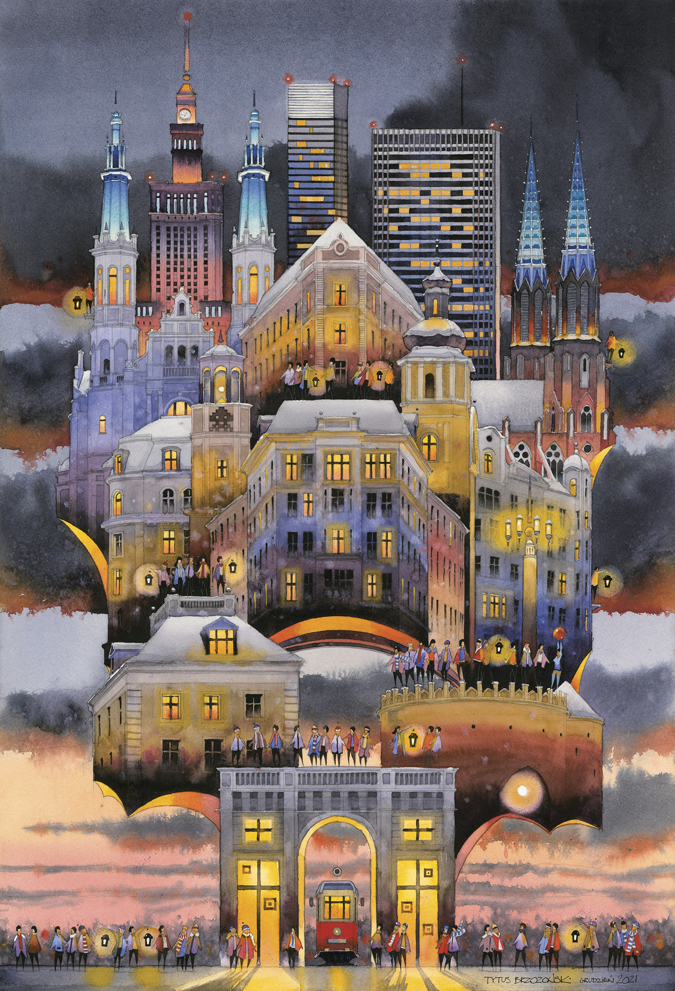 Tytus Brzozowski (Warszawa 1984, mieszka w Warszawie) - ukończył Wydział Architektury Politechniki Warszawskiej, jest akwarelistą i architektem zafascynowanym duszą miasta. Często zestawia sylwetki gmachów i ludzi, tworząc barwne, pogodne sceny z pogranicza rzeczywistości i fantastyki. Jego ulubioną bohaterką jest Warszawa. Pomimo surrealistycznego posmaku, obrazy związane są z prawdziwą historią polskich miast. Artysta niekiedy wychodzi poza sferę akwareli, tak jak zrobił to na potrzeby projektów sześciu warszawskich murali, wielkoformatowej książki obrazkowej Miastonauci, a także pejzaży zrujnowanej stolicy do filmu Po apokalipsie.
