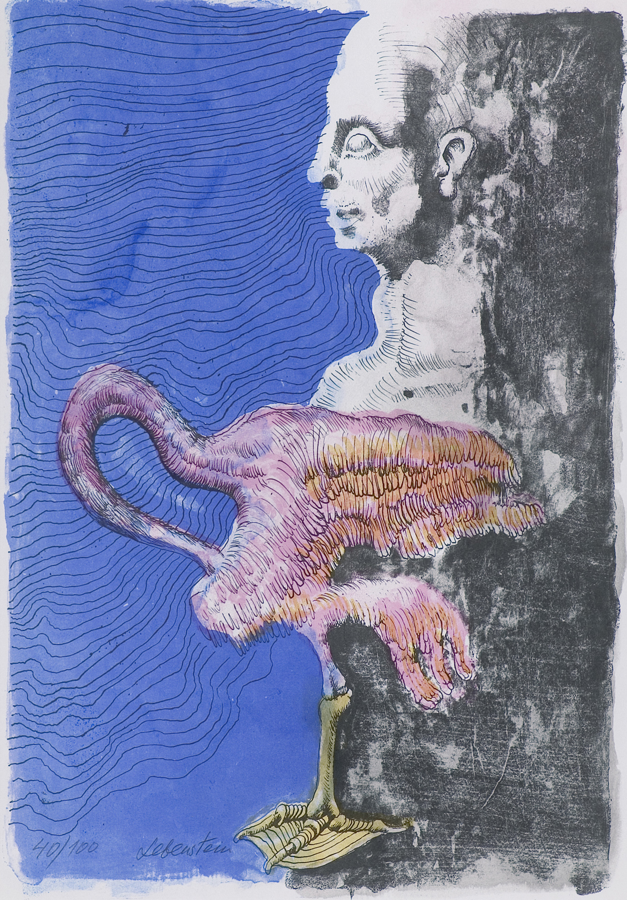 Jan Lebenstein (Brześć Litewski 1930 - Kraków 1999) w latach 1948-1954 studiował malarstwo w ASP w Warszawie pod kierunkiem prof. Eugeniusza Eibischa i Artura Nachta-Samborskiego. W 1955 wziął udział w wystawie w warszawskim Arsenale. Zaprzyjaźniony w czasie studiów z Mironem Białoszewskim, swą pierwszą wystawę indywidualną pokazał w 1956 w Teatrze na Tarczyńskiej. W 1959 zdobył Grand Prix de la Ville de Paris na I Biennale Młodych w Paryżu i w tym roku przeniósł się na stałe do Paryża. Po seriach "figur kreślonych" (na papierze milimetrowym) i "figur hieratycznych" z lat 1955-1958 maluje cykl "figur osiowych" (1958-1962), które wystawia w Paryżu i USA. Równolegle w 1960 zaczyna rysowane "karnety", rodzaj dziennika, który w przyszłości dostarczy motywów wykorzystanych w obrazach. W latach 1964-1965 maluje "Bestiarium", cykl fakturowych, archaizowanych stworów przypominających prehistoryczne wykopaliska. Bezpośrednio po nich wprowadza do swych obrazów postaci ludzkie i fantastyczne, odgrywające sceny ni to mitologiczne, ni to ze snu, często przesycone erotyką. W 1970 projektuje witraże dla Centre du Dialogue w Paryżu. W W 1971 otrzymuje obywatelstwo francuskie 1974 powstają gwasze inspirowane Folwarkiem zwierzęcym George'a Orwella. W latach 1976-1989 tworzy wyłącznie w technice gwaszu i pastelu, podejmując tematykę mitologiczną i zaczerpniętą z Biblii: cykle ilustracji do Księgi Hioba (wyd. 1979) i do Apokalipsy (wyd. 1986) w nowych przekładach Czesława Miłosza. W 1989 powraca do malarstwa olejnego (cykl "Pergamon"). Artysta otrzymał m. in. nagrodę Fundacji im. Alfreda Jurzykowskiego w 1976, Nagrodę Muzeum Archidiecezji Warszawskiej w 1985, Nagrodę im. Jana Cybisa w 1987.