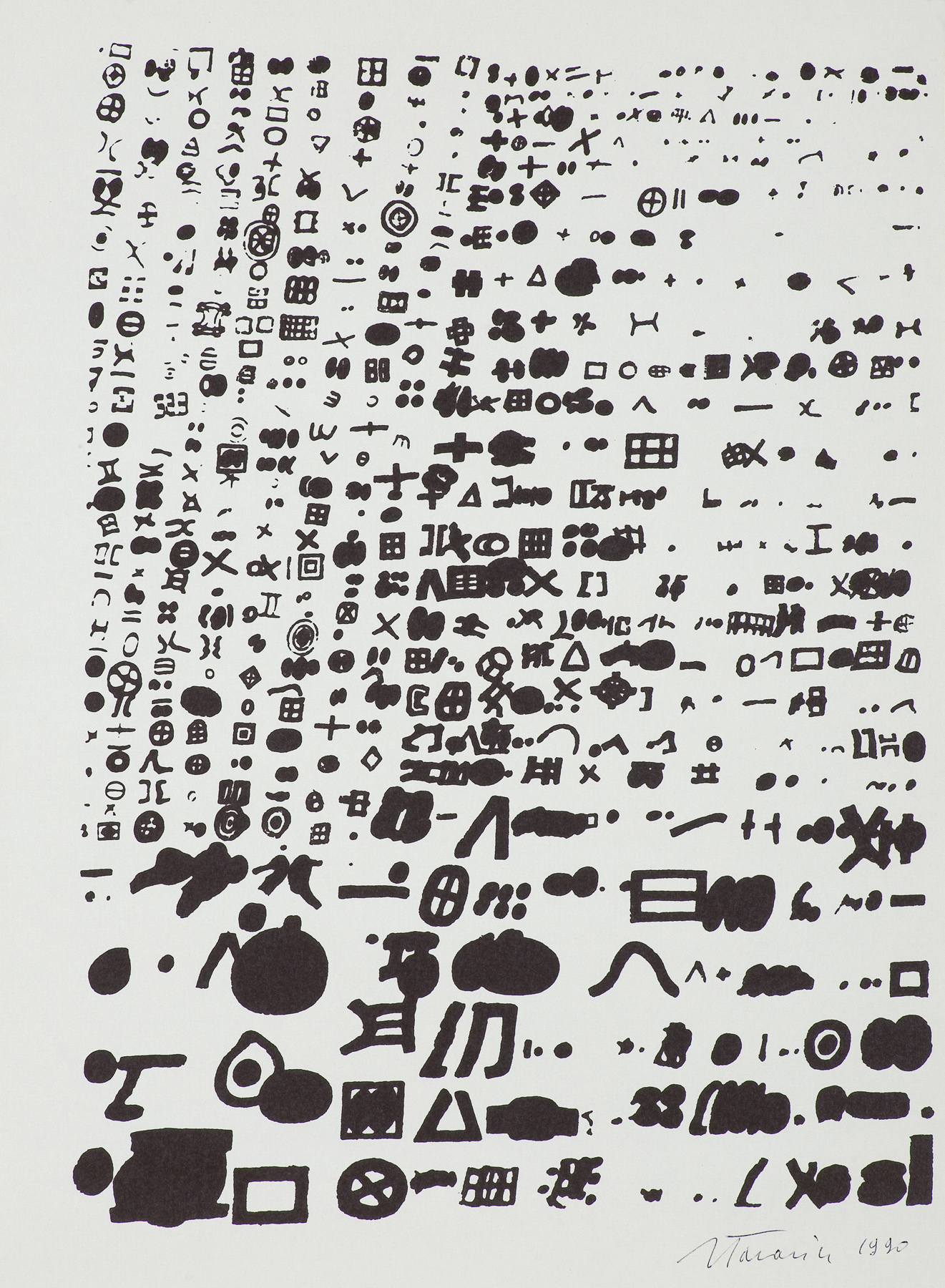 Jan Tarasin (Kalisz 11 IX 1926 - Warszawa 8 VIII 2009) studiował malarstwo w ASP w Krakowie pod kierunkiem prof. Zbigniewa Pronaszki (1946-1951). Jeszcze jako student zadebiutował na I Wystawie Sztuki Nowoczesnej w Krakowie w 1948/49. W połowie lat 50. stworzył cykle litografii: „Nowa Huta i jej mieszkańcy“, 1954, „Dom“, 1955). W pierwszym przeciwstawił się oficjalnemu optymizmowi, w drugim, operując symboliką martwej natury, zawarł treści egzystencjalne i odnoszące do niedawnego dramatu wojny. Po 1956 zaczął malować obrazy niefiguratywne. Układy wyodrębnionych elementów (określanych jako „przedmioty“) umieszczane były przez artystę na płaszczyźnie (cykl „Wnętrze“, 1957) ), lub w aluzyjnej przestrzeni (cykle „Uczta“, 1957, „Brzeg“, 1962-1964, „Przedmioty policzone“, od 1968, „Antykwariat“, 1968). Zasada ta utrzymuje się w jego malarstwie w następnych latach, różnice między okresami twórczości dotyczą sposobu opracowania „przedmiotów“ i ich usytuowania w przestrzeni obrazu lub wobec tła. Od lat 70. „przedmioty“ zmieniają się w graficzne, zwykle czarne znaki na jasnych tłach (cykl „Kolekcja“, od 1971). Tła z kolei bywają iluzyjnie przestrzenne, zróżnicowane walorowo, miękkie. W latach 90. artysta wrócił do kolorystycznego, bardziej malarskiego rozwiązywania zarówno znaków, jak i teł, często ciemnych lub przenikających się z „przedmiotami“ (cykl „Wylęgarnia przedmiotów“, 1992). Tarasin od 1962 jest członkiem „Grupy Krakowskiej“. W 1963-67 uczył na Wydziale Architektury Wnętrz krakowskiej ASP. W 1967 przeniósł się do Warszawy, w 1974 podjął pracę pedagogiczną na Wydziale Malarstwa ASP w Warszawie. W 1987-90 był rektorem tej uczelni. W 1976 otrzymał Nagrodę Krytyki Artystycznej im. Cypriana Kamila Norwida, w 1984 Nagrodę im. Jana Cybisa.; Nagroda na MB Sztuki w San Marino 1965. Równolegle z malarstwem zajmował się rysunkiem i grafiką - do lat 60. litografią, od 1974 serigrafią. W 1974-1981 wydał 8 autorskich „Zeszytów“ z serigrafiami i własnymi tekstami. W 1995 w Galerii Zachęta odbyła się wystawa artysty, której towarzyszył monograficzny katalog.