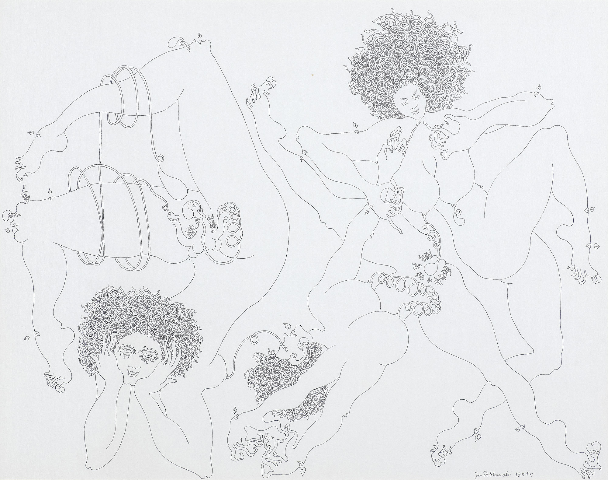 Jan Dobkowski (Łomża 1942, mieszka w Warszawie) studiował w latach 1962-1968 na Wydziale Malarstwa warszawskiej ASP pod kierunkiem prof. Juliusza Studnickiego i Jana Cybisa. Będąc jeszcze na studiach, w 1966, utworzył duet artystyczny, w którym jego partnerem był Jerzy (Jurry) Zieliński. Ich pierwsza wspólna wystawa pn. Neo-Neo-Neo odbyła się w Warszawie w 1967. Wystawiali wspólnie do 1970. W 1968 powstały pierwsze zielono-czerwone obrazy Dobkowskiego (używającego w tym czasie pseudonimu Dobson). W pracach tych, operujących giętkimi, falistymi liniami, w których upatrywano wpływów secesji, artysta używał sposobów rodem z op-artu dla wywołania złudzeń optycznych (wirowanie, mżenie, pozorny ruch form). Równolegle z obrazami tworzył też formy z płyt i folii do montowania w przestrzeni. Złoty medal na Sympozjum Złotego Grona w Zielonej Górze w 1971 i blisko roczny pobyt w USA na stypendium Fundacji Kościuszkowskiej w 1972 to kolejne etapy pełnej sukcesów kariery malarza. Wyraźną zmianę nastroju i wymowy jego prac przyniosły wydarzenia 1980-1981 roku, zwłaszcza wprowadzenie stanu wojennego. Monochromatyczne, ciemne płótna znaczył wtedy nikłymi, wiotkimi liniami rysunku. Najczęstszym motywem były patriotyczne i religijne symbole, dopowiadane tytułami nawiązującymi do realiów czasu. Kolejna radykalna zmiana nastąpiła ok. 1990. Symbolicznym zwiastunem nowego okresu stał się olbrzymi, radosny, eksplodujący bogactwem barw, kształtów i ruchu obraz ...a życie sobie płynie... (394 x 588 cm) z 1990-1991. Podobne cechy formalne charakteryzują twórczość artysty w całej dekadzie lat 90. Równolegle z malarstwem Dobkowski pracuje nad rysunkiem, będącym bardzo ważnym dopełnieniem jego twórczości.