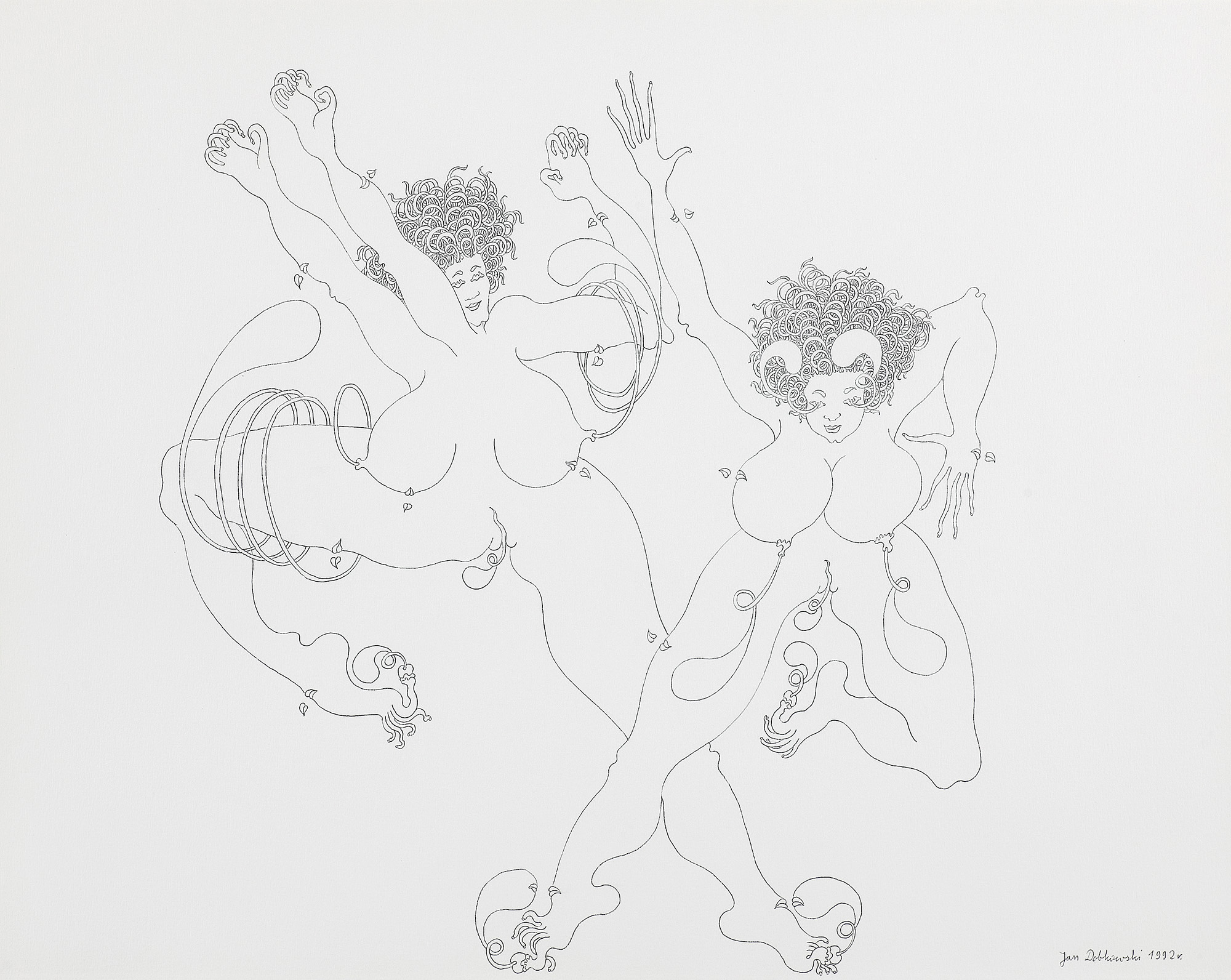 Jan Dobkowski (Łomża 1942, mieszka w Warszawie) studiował w latach 1962-1968 na Wydziale Malarstwa warszawskiej ASP pod kierunkiem prof. Juliusza Studnickiego i Jana Cybisa. Będąc jeszcze na studiach, w 1966, utworzył duet artystyczny, w którym jego partnerem był Jerzy (Jurry) Zieliński. Ich pierwsza wspólna wystawa pn. Neo-Neo-Neo odbyła się w Warszawie w 1967. Wystawiali wspólnie do 1970. W 1968 powstały pierwsze zielono-czerwone obrazy Dobkowskiego (używającego w tym czasie pseudonimu Dobson). W pracach tych, operujących giętkimi, falistymi liniami, w których upatrywano wpływów secesji, artysta używał sposobów rodem z op-artu dla wywołania złudzeń optycznych (wirowanie, mżenie, pozorny ruch form). Równolegle z obrazami tworzył też formy z płyt i folii do montowania w przestrzeni. Złoty medal na Sympozjum Złotego Grona w Zielonej Górze w 1971 i blisko roczny pobyt w USA na stypendium Fundacji Kościuszkowskiej w 1972 to kolejne etapy pełnej sukcesów kariery malarza. Wyraźną zmianę nastroju i wymowy jego prac przyniosły wydarzenia 1980-1981 roku, zwłaszcza wprowadzenie stanu wojennego. Monochromatyczne, ciemne płótna znaczył wtedy nikłymi, wiotkimi liniami rysunku. Najczęstszym motywem były patriotyczne i religijne symbole, dopowiadane tytułami nawiązującymi do realiów czasu. Kolejna radykalna zmiana nastąpiła ok. 1990. Symbolicznym zwiastunem nowego okresu stał się olbrzymi, radosny, eksplodujący bogactwem barw, kształtów i ruchu obraz ...a życie sobie płynie... (394 x 588 cm) z 1990-1991. Podobne cechy formalne charakteryzują twórczość artysty w całej dekadzie lat 90. Równolegle z malarstwem Dobkowski pracuje nad rysunkiem, będącym bardzo ważnym dopełnieniem jego twórczości.