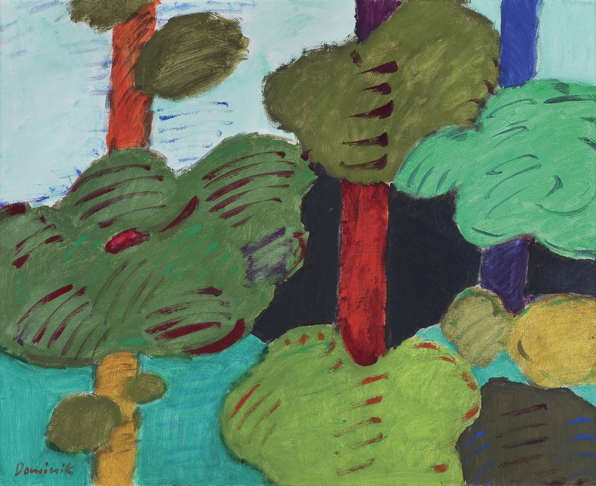 Tadeusz Dominik (Szymanów 14 I 1928 - Warszawa 20 V 2014) studiował na Wydziale Malarstwa ASP w Warszawie pod kierunkiem prof. J.Cybisa (1946-51, dyplom 1953). Od 1951 był pedagogiem na macierzystym Wydziale, początkowo jako asystent Cybisa. Od 1965 prowadził własną pracownię, w 1979 otrzymał tytuł profesora. W 1990 przeszedł na emeryturę. W czasie studiów oddziałały nań - za pośrednictwem osobowości i sztuki Cybisa - idee polskiego koloryzmu, które następnie twórczo i samodzielnie kontynuował. Początkowo tworzył obrazy figuratywne. Debiutował na słynnej wystawie w warszawskim Arsenale w 1955, gdzie zdobył nagrodę. W tym okresie obok malarstwa uprawiał drzeworyt, operujący szerokimi płaszczyznami bieli i czerni (drzeworyty wystawiał m.in. na Biennale w Wenecji w 1956). W drugiej poł. lat 50. zaczął malować obrazy abstrakcyjne, początkowo utrzymane w ekspresyjnej i spontanicznej stylistyce malarstwa informel. W latach 60. wzbogacił swe prace o efekty fakturowe. Niezmienną inspiracją była dla malarza natura, bogactwo i kolorystyka jej form. Pozostał jej wierny do dziś, poddając zmianom sam sposób malowania. Stopniowo rozjaśniał i wygładzał swe kompozycje, wprowadzając efekty dekoracyjne, jak rytmiczne powtórzenia form czy rodzaj malowanych „rastrów“, regularnie znaczących fragmenty kompozycji. Wśród wielu nagród otrzymał m.in. laur „Złotego Grona“ w Zielonej Górze w 1963, Grand Prix Festiwalu Polskiego Malarstwa Współczesnego w Szczecinie w 1968, nagrodę im. George’a Rowney’a w Londynie w 1973 i Nagrodę im. Jana Cybisa w Warszawie w 1973. Równolegle z malarstwem zajmował się gobelinem, ceramiką, również grafiką komputerową.