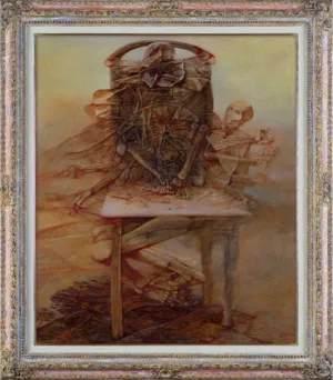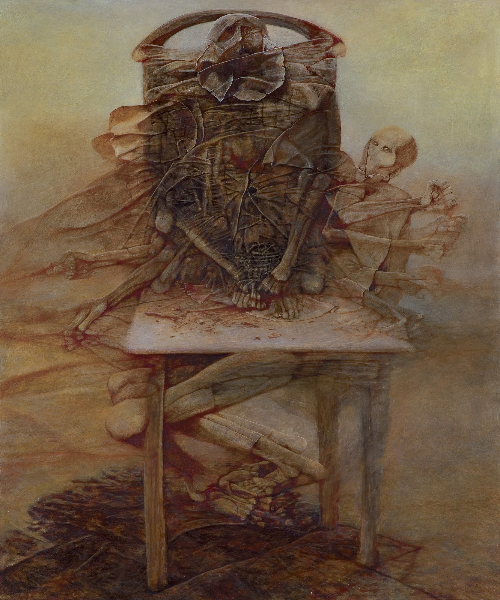 Zdzisław Beksiński (Sanok 24 II 1929 - Warszawa 21 II 2005) studiował w latach 1947-1952 na Wydziale Architektury Politechniki Krakowskiej. Był artystą samoukiem, który osiągnął niekwestionowaną pozycję w polskiej sztuce współczesnej, potwierdzoną obecnością jego prac na prestiżowych wystawach i w kolekcjach muzealnych. Początkowo zajmował się fotografią, którą interesował się od lat studenckich, po 1956 zyskując uznanie jako twórca fotogramów o estetyce opartej o efekty fakturowe. W latach 1958-1962 tworzył abstrakcyjne obrazy-reliefy o bogatej fakturze, głównie metalowe, będące odmianą malarstwa materii. Pod koniec tego okresu powstawały ażurowe formy o kształtach figur i pełnoplastyczne rzeźby w metalu. Kolejnym etapem jego twórczości były lata 1962-1974, kiedy poświęcał się głównie rysunkowi. W latach 60. rysował piórkiem i tuszem figuralne kompozycje odznaczające się karykaturalną deformacją postaci. Od końca lat 60. tworzył rysunki węglem i kredkami, będące monochromatyczną odmianą jego równoległej twórczości malarskiej. Od 1974 zajmował się niemal niepodzielnie malarstwem. Jego charakterystyczny styl bazował na perfekcji technicznej, której towarzyszyła niezwykłość wizji. Malował świat po katastrofie, naznaczony piętnem śmierci i rozpadu. Jego obrazy zaludniają postaci i stwory o ludzkich wprawdzie bądź zwierzęcych kształtach, lecz o cechach fantomów, automatów lub rozpadających się trucheł. Artysta nie nadawał swym obrazom i rysunkom tytułów (poza porządkującymi symbolami), akcentując w ten sposób swój brak zainteresowania dla literackiej strony przedstawień. Sam mówił, że malując całkowicie poddaje się wizji, „fotografuje“ ją. W ostatnich latach włączył do swego warsztatu artystycznego elektroniczne techniki generowania obrazu, które wykorzystywał do tworzenia komputerowych fotomontaży. Sztuka Beksińskiego, wielokrotnie wystawiana i omawiana, budzi skrajne emocje wśród znawców i publiczności.