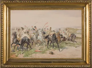 Prezentowany obraz jest zapewne jednym ze szkiców kompozycyjnych, które artysta konsultował z Janem Aleksandrem Fredrą przed wykonaniem obrazu końcowego. Dowodem tego mogą być nieznaczne różnice względem ostatecznej wersji obrazu. Kazimierz Olszański, wybitny badacz twórczości Juliusza Kossaka, wskazuje, że po śmierci artysty kompozycję tą reprodukowano z błędnym tytułem jako Aleksander Fredro (ojciec) pod Hanau. Tak było u Stanisława Witkiewicza (Juliusz Kossak, wyd. I, Warszawa 1900, s. 129), Mariana Kukieli (Dzieje oręża polskiego w epoce napoleońskiej, Poznań, 1912, s. 383) i w wydanych w 1917 roku pamiętnikach Aleksandra Fredry z wojen napoleońskich (A. Fredro, Trzy po trzy, Warszawa 1917, s. 25). Możliwe jest zatem, że w 1939 roku Wojciech Kossak, potwierdzając autentyczność obrazu ojca, odwołał się do błędnie nadanego przez Stanisława Witkiewicza tytułu Aleksander Fredro pod Hanau.