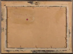 Na odwrocie oświadczenie syna artysty o autentyczności obrazu (atramentem): Stwierdzam oryginalność obrazu | pt. „Aleks. Fredro pod Hanau 1813 roku | malowany przez mojego ś.p. Ojca Juliusza | w marcu 1939 Wojciech Kossak, poniżej lakowa pieczęć ze słabo odbitym herbem Kos.