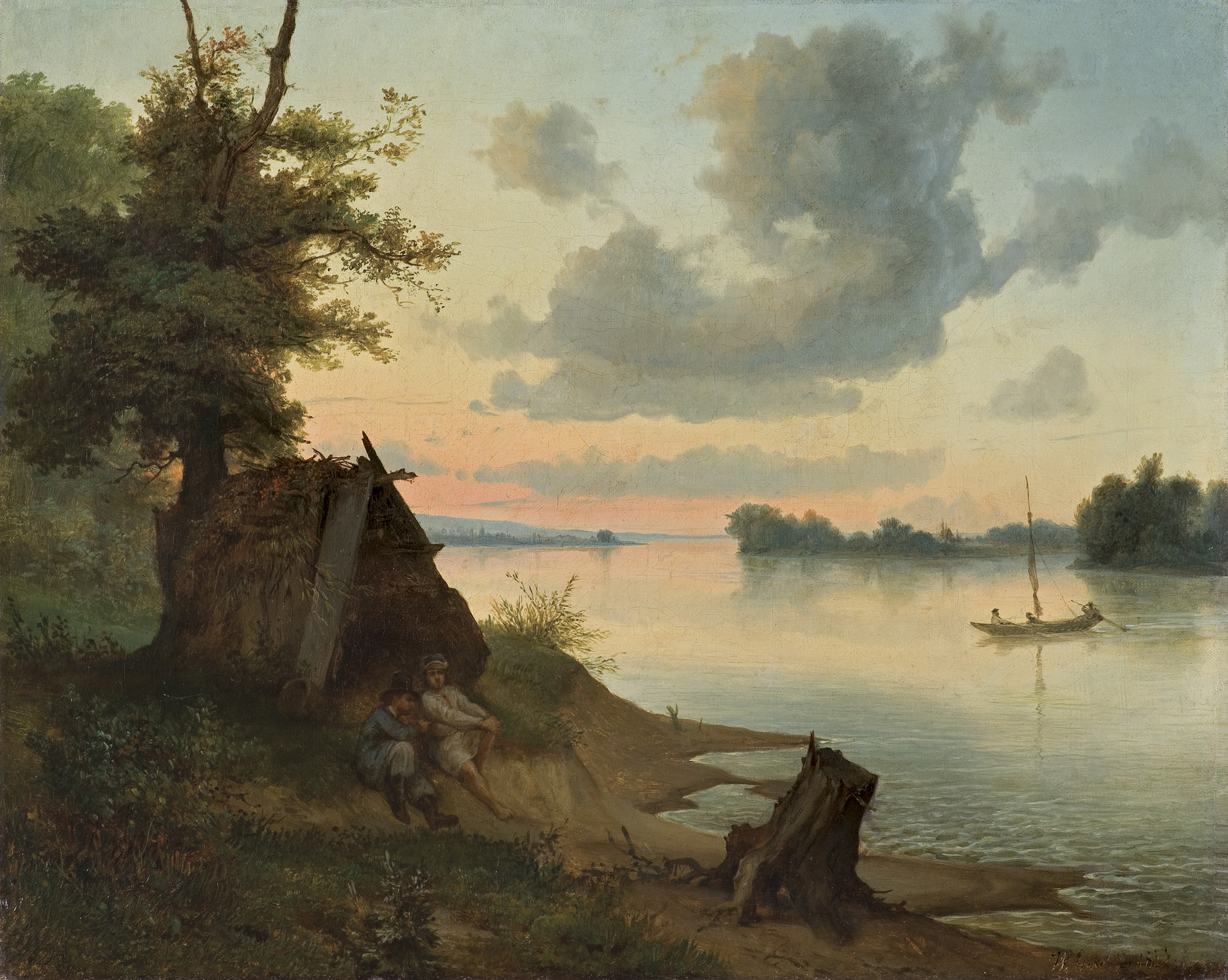 Na odwrocie na płótnie dublażowym nalepka muzeum im. Jacka Malczewskiego (druk): MUZEUM im. Jacka Malczewskiego | Rynek 11 | 26-600 RADOM | tel. (0-48) 36-243-29 | Galeria Malarstwa Polskiego | wrzesień 2000 - kwiecień 2001 | Wojciech Gerson | Pejzaż | wł. prywatna.; poniżej napis: Brzegi Wisły | Malował: | Wojciech Gerson. 1853 r.