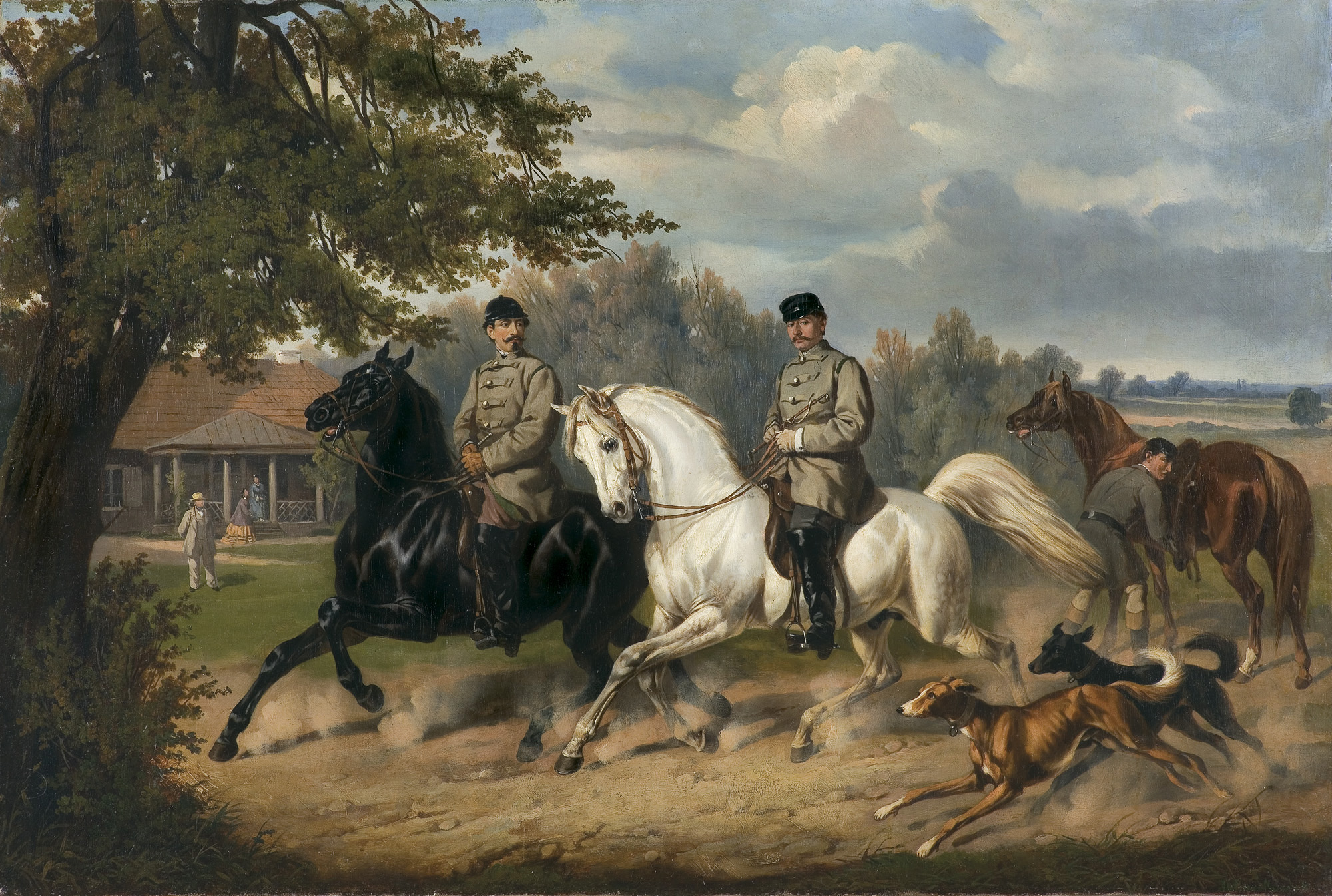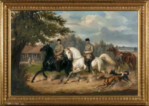 Portret konny przedstawia braci Józefa i Władysława Rawiczów w czasie powrotu z polowania z chartami. Schwytany przez psy zając został właśnie przytroczony do siodła. Artysta postanowił ukazać portretowanych w czasie jednej z najpopularniejszych rozrywek w dawnej Polsce. Łowy z chartami odbywały się w całym kraju już w XII wieku, a o wydatkach na utrzymanie tych psów na dworze królewskim pisał Gall Anonim. Polowano wszędzie, gdzie pozwalały na to duże otwarte przestrzenie. Zgodnie z panującą modą, portrety ziemiaństwa osadzane były na tle ich majątków. Zatem niemal pewne jest, że Kossak umieścił portretowanych w otoczeniu ich podlaskiego dworu. Możliwe jest również, że ukazane na drugim planie postaci to ich ojciec – Aleksander Jan, matka – Maria Anna z Gutmanów, i siostra Maria.