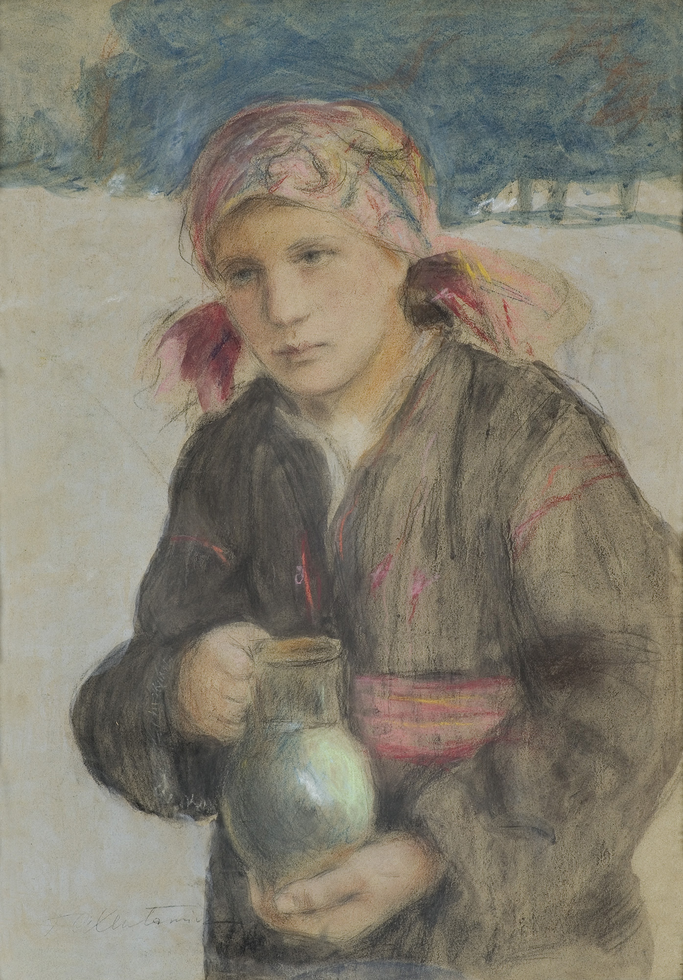 Teodor Axentowicz (Braszów w Siedmiogrodzie 1859 - Kraków 1938) – malarz, pastelista, litograf – był jednym z najbardziej znanych i cenionych malarzy polskich. Kształcił się w Akademii Sztuk Pięknych w Monachium pod kierunkiem Gabriela Hackla, Aleksandra Wagnera, Gyuli Benczúra. Studia uzupełniał w Paryżu, gdzie następnie przebywał przez lat kilkanaście. Brał udział w paryskich Salonach; w 1890 otrzymał członkostwo Société Nationale des Beaux-Arts. W tym czasie wielokrotnie wyjeżdżał również do Londynu. W 1895 powrócił do kraju i zamieszkał na stałe w Krakowie, powołany na profesora tamtejszej Szkoły Sztuk Pięknych (od 1900 Akademii). W uczelni tej nauczał nieprzerwanie do 1934, dwukrotnie pełniąc funkcję rektora (lata 1910-11 oraz 1927-28). Był jednym z członków-założycieli Towarzystwa Artystów Polskich „Sztuka”, członkiem wiedeńskiej „Secesji” i współpracownikiem jej pisma „Ver Sacrum”. Powodzenie przyniosły mu zwłaszcza idealizowane wizerunki wytwornych dam oraz wdzięczne portrety dziecięce. Malował też obrazy o tematyce rodzajowej; był jednym z pierwszych malarzy Huculszczyzny i Hucułów. Tworzył obrazy historyczne i kompozycje symboliczne związane z upływem czasu, przemijaniem, starością. We wczesnym, monachijskim okresie były to obrazy utrzymane w duchu akademickiego realizmu; na późniejszą twórczość artysty wywarło wpływ angielskie malarstwo XVIII w. oraz dzieła malarzy współczesnych - Boldoniego, Whistlera, Sargenta. Jego obrazy cechuje dekoracyjność, elegancja, świeżość subtelnej gamy kolorów i delikatna secesyjna stylizacja. Początkowo malował olejno i akwarelą, a po 1890 przede wszystkim mistrzowsko opanowaną techniką pastelu. Zajmował się ilustratorstwem i litografią, projektował plakaty wystaw „Sztuki”.