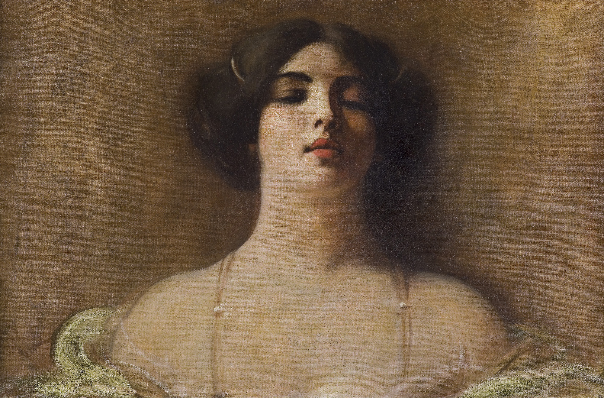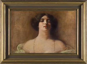 Prezentowane dzieło ukazuje ponętną, piękną kobietę z długim naszyjnikiem na nagim dekolcie i ramionami spowitymi delikatnym, zwiewnym szalem. Mimo iż artysta ukazuje modelkę w ujęciu powyżej piersi, to obraz emanuje aurą zmysłowości. Wąski kadr i stonowana kolorystyka sprawiają, że jest to kameralny wizerunek. Natomiast upozowanie i głęboki dekolt modelki nadają mu erotyczny podtekst, tak charakterystyczne dla twórczości artysty.