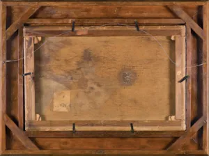 Na odwrocie na górnej listwie krosna nalepka składu farb i przyborów artystyczno-malarskich Juliana Burofa w Warszawie; na lewej listwie krosna fragment nalepki Towarzystwa Zachęty Sztuk Pięknych w Królestwie Polskiem; na prawej listwie krosna numery (ołówkiem) odnoszące się zapewne do wielkości podobrazia; ponadto na płótnie nalepka z pieczęcią wydziału zabytków na Nowym Świecie 45; poniżej numer (tuszem): No 29-.