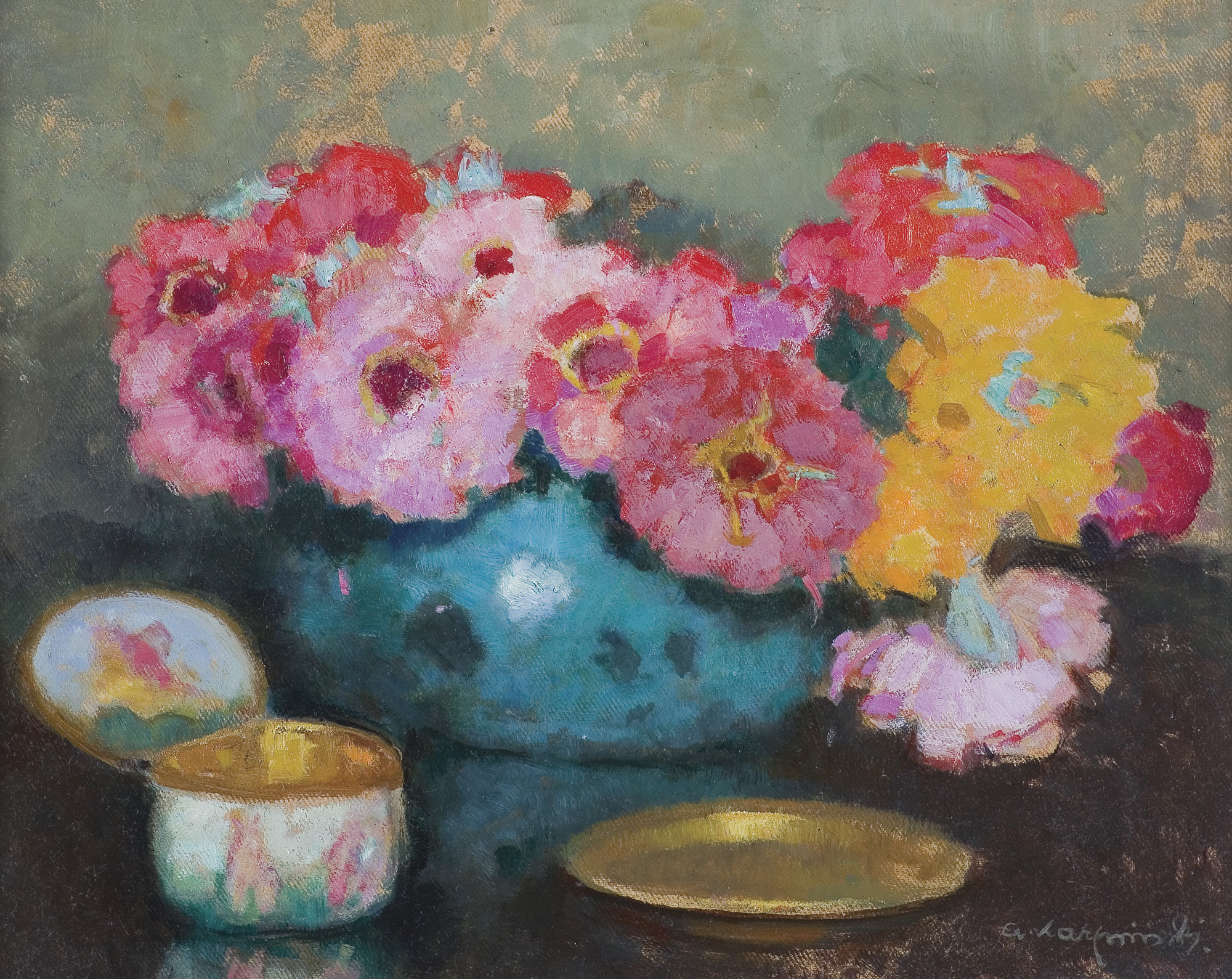 Alfons Karpiński (Rozwadów, dziś dzielnica Stalowej Woli 1875 - Kraków 1961) w latach 1891-1899 studiował w krakowskiej Szkole Sztuk Pięknych pod kierunkiem Floriana Cynka, Izydora Jabłońskiego, Władysława Łuszczkiewicza i Leona Wyczółkowskiego, a następnie kształcił się jeszcze u Antona Ažbégo w Monachium (1903), u Kazimierza Pochwalskiego w Wiedniu, a od 1907 także w Paryżu. Podróżował do Włoch i Londynu. Stale mieszkał w Krakowie; związany z tamtejszym środowiskiem skupionym wokół „Zielonego Balonika” projektował dekoracje do przedstawień kabaretu. Należał do Tow. Artystów Polskich „Sztuka”, grupy „Zero”, był członkiem wiedeńskiego stowarzyszenia „Secesja” i krakowskiego TPSP. Uczestniczył w wielu wystawach w kraju i za granicą. W czasie I wojny światowej służył w armii austriackiej. Na bogatą twórczość artysty składają się wczesne sceny rodzajowe z podkrakowskiej wsi, pejzaże i portrety, wśród nich zwłaszcza portrety kobiece, które przyniosły mu szczególną popularność. Z czasem głównym – obok portretu – tematem jego obrazów stały się martwe natury z kwiatami, dekoracyjne kompozycje o stonowanej gamie barwnej. Artysta zajmował się także grafiką i ilustratorstwem.