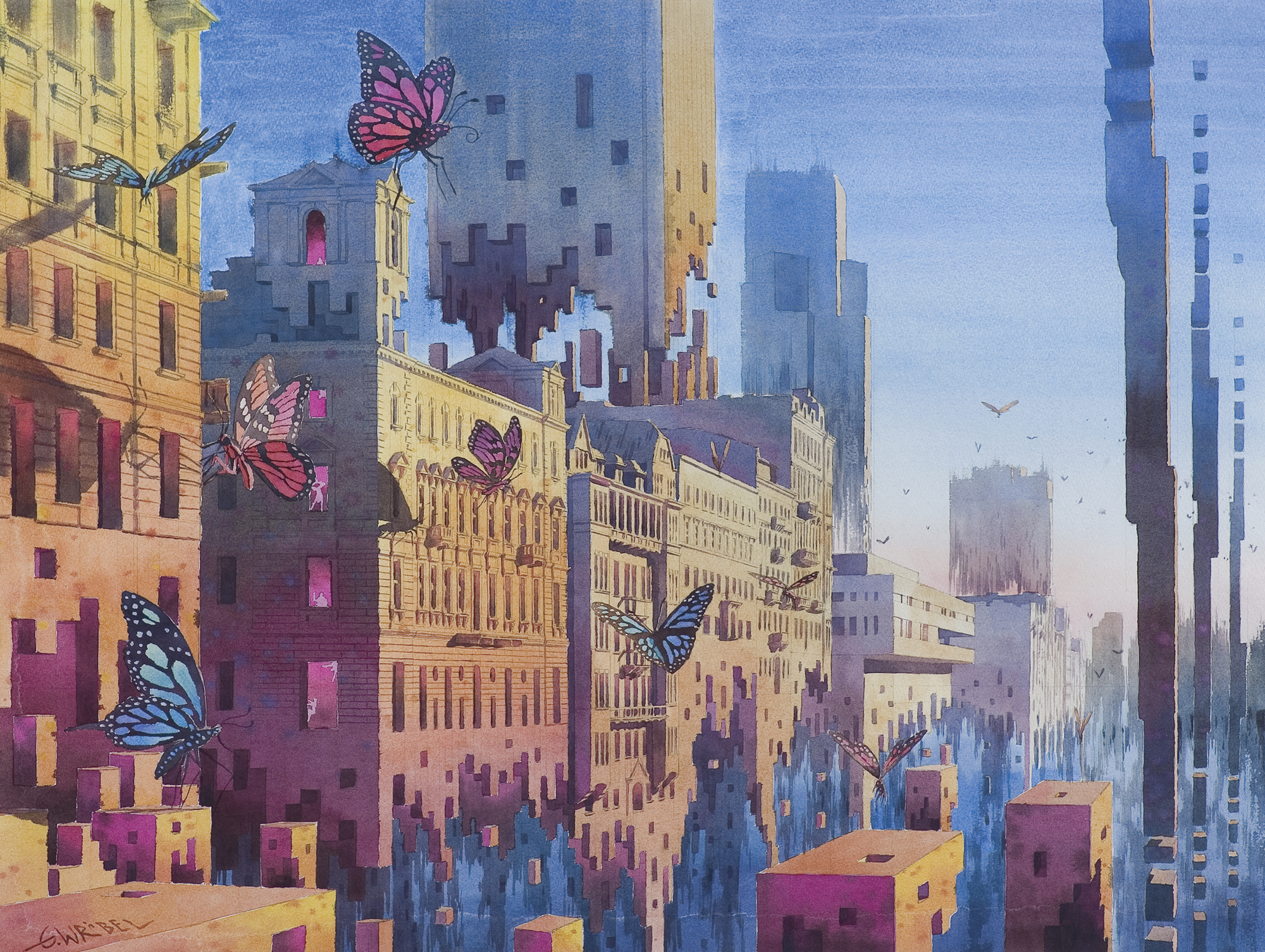 Grzegorz Wróbel urodził się w Warszawie w 1983 roku. Tutaj podjął kluczowe dla niego studia na Wydziale Architektury Politechniki Warszawskiej w 2002 roku. Mimo iż rysunkiem i malarstwem interesował się od dziecka, dopiero na studiach rozwinął swoje umiejętności. Wtedy poznał technikę akwareli i do dzisiaj zgłębia jej tajniki. Fascynację wodnymi farbami postanowił przelewać na innych, co realizuje, ucząc w prywatnej szkole rysunku. Jest dla niego ogromną satysfakcją, kiedy widzi, że może tak trudnej techniki nauczyć innych i jaką im to sprawia radość. W akwareli szuka głównie światła i tego potrafi ono "malować" przeróżne rzeczy. Na jego twórczość akwarelową istotne piętno odcisnęła architektura. To ona nauczyła go estetyki,podejścia do kadrowania prac i wyboru tematów. Dlatego też w jego akwarelach najwięcej jest architektury, a szczególnie tej, którą sam zwiedził i poznał. Większość prac to zapamiętane wrażenia, kolory i światło z odbytych przez niego podróży. Zwiedził w ten sposób Berlin, Paryż, Barcelonę, Pragę, Brno, Wiedeń czy Sycylię. Bardzo często tworzy z natury, a pozostałe prace maluję z własnych fotografii. Zamiłowanie do akwareli musi jednak dzielić z architekturą, gdyż jest czynnym architektem.