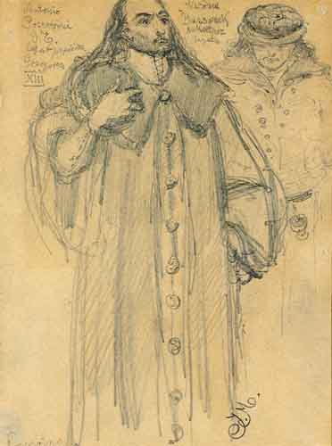 Jan Matejko (Kraków 1838 - Kraków 1893) - najwybitniejszy polski malarz historyczny; studia malarskie rozpoczął pod kierunkiem W. Łuszczkiewicza i W. K. Stattlera w krakowskiej Szkole Sztuk Pięknych (lata 1852-1858). Następnie uczył się w Akademii monachijskiej u H. Anschütza (1859) i przez dwa miesiące w Akademii wiedeńskiej u C. Rubena (1860). Po studiach mieszkał i pracował w Krakowie. W 1873 objął stanowisko dyrektora tamtejszej Szkoły Sztuk Pięknych, pełniąc tę funkcję aż do śmierci. Dużo podróżował - wielokrotnie wyjeżdżał do Paryża (w latach 1865-1880), Wiednia (1866-1888), w 1872 był w Konstantynopolu, a rok później w Pradze i Budapeszcie, odwiedzał również Włochy (1878-1879 i 1883). Był członkiem licznych akademii i towarzystw artystycznych m.in. Académie des Beaux-Arts (1873) i Instytutu Francuskiego (1874) w Paryżu, berlińskiej Akademii Sztuki (1874), Akademii Rafaelowskiej w Urbino (1878) i Künstlersgenossenschaft w Wiedniu (1888). W 1864 został członkiem Towarzystwa Naukowego w Krakowie, w 1887 otrzymał doktorat filozofii honoris causa Uniwersytetu Jagiellońskiego. Był twórcą wielkich i znanych płócien, m.in. Kazania Skargi, Rejtana, Unii Lubelskiej, Batorego pod Pskowem, Bitwy pod Grunwaldem, Hołdu Pruskiego czy Kościuszki pod Racławicami. Malował także portrety i - rzadziej - sceny religijne czy rodzajowe. Ważną rolę w jego twórczości odgrywał rysunek - artysta opracował, m.in. album Ubiory w Polsce od 1200 do 1795 oraz rysunkowy cykl Poczet królów i książąt polskich. W latach 1889-1891, wraz z zespołem uczniów, pracował nad polichromią kościoła Mariackiego w Krakowie. W rodzinnym domu malarza, przy ulicy Floriańskiej w Krakowie od 1898 mieści się poświęcone mu muzeum - Dom Matejki (Oddział MNK).