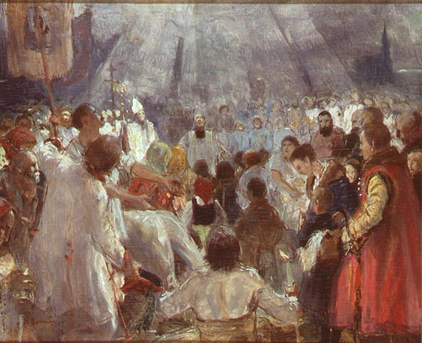 Stanisław Kaczor-Batowski (Lwów 1866 - Lwów 1946) - studia artystyczne rozpoczął w krakowskiej Szkole Sztuk Pięknych pod kierunkiem Władysława Łuszczkiewicza i Floriana Cynka. Później kształcił się w Akademii w Wiedniu, a w l. 1887-1889 także w Akademii w Monachium pod kierunkiem A.Liezen-Mayera. Podróżował do Włoch, Hiszpanii, Maroka i na Krym; był także w Stanach Zjednoczonych. Stale mieszkał we Lwowie, gdzie w latach 1903-1914 prowadził własną szkołę malarstwa. Był współzałożycielem lwowskiego Stowarzyszenia Artystów „Młoda Polska”. Znany jest przede wszystkim jako batalista, twórca takich płócien, jak Atak husarii pod Chocimiem (Muzeum Wojska Polskiego w Warszawie), Pułaski pod Savannach, Bitwa pod Zadwórzem(Muzeum Wojska Polskiego w Warszawie). Malował także pejzaże, portrety i obrazy religijne. Zajmował się także ilustratorstwem, m.in. wykonał cykle kartonów i ilustracji do utworów J. Słowackiego, powieści H. Sienkiewicza i E. Orzeszkowej. Projektował witraże (np. do katedry łacińskiej we Lwowie), zajmował się malarstwem ściennym, współpracując m.in. przy dekoracji lwowskiego teatru.