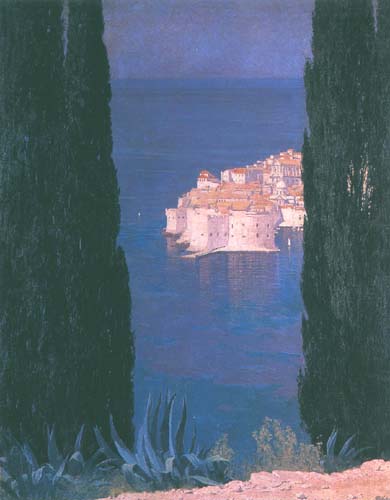 Edward Okuń (Wólka Zerzyńska /obecnie Zerzeńska/ k. Warszawy 1872 - Skierniewice 1945) – malarz, rysownik, ilustrator – studia artystyczne rozpoczął w warszawskiej Klasie Rysunkowej u Wojciecha Gersona. W latach 1891-1893 kształcił się w krakowskiej Szkole Sztuk Pięknych, m.in. u Jana Matejki, od 1893 w Monachium u Antona Ažbe, Stanisława Grocholskiego i Szymona Hollosy’ego. Studia uzupełniał w Paryżu. Od roku 1898 stale mieszkał we Włoszech – w Rzymie, a okresowo także w pobliskim Anticoli Corrado, we Florencji, Sorrento, Amalfi i na Capri. W 1914 podróżował do Egiptu. W roku 1921 wrócił do Warszawy, gdzie w latach 1925-1930 był profesorem Szkoły Sztuk Pięknych. Jeszcze kilkakrotnie wyjeżdżał do Włoch (m.in. w 1928, 1937, 1938), a w latach 1927 oraz 1929-1932 jeździł do Jugosławii, gdzie powstał cykl pejzaży Znad Adriatyku - "Jadran". Malował dekoracyjne, stylizowane portrety, idylliczne pejzaże i kompozycje o wątkach fantastycznych i baśniowych, bliskie symbolizmowi i secesji. Często sam projektował ramy do swoich obrazów, traktując je jako integralną część tych dzieł. Był wybitnym twórcą grafiki książkowej; wykonywał ilustracje, winiety, projekty okładek, inicjały i przerywniki, współpracując m.in. z warszawskim pismem „Chimera”.