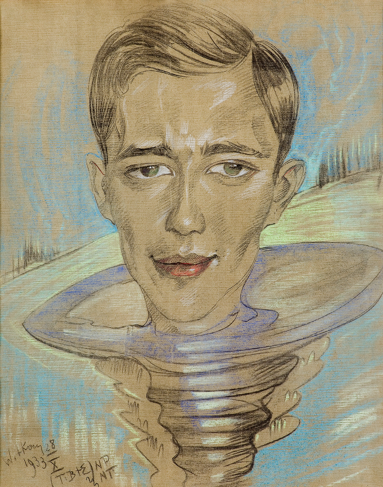 Witkacy wykonywał barwnymi pastelami portrety w pięciu kategoriach, zgodnie z Regulaminem jednoosobowej Firmy Portretowej „S.I. Witkiewicz“, oznaczonych kolejnymi literami od A do E. Niekiedy artysta łączył ze sobą dwa typy, np. B z E, jak miało to miejsce w przypadku prezentowanego portretu męskiego wykonanego 28 X 1933 roku. Typ B zakładał „rodzaj charakterystyczny, bez cienia karykatury [...] stosunek do modela obiektywny“, zaś typ E dopuszczał „dowolną interpretację psychologiczną, według intuicji Firmy“. W praktyce oznaczało to często wprowadzenie do tradycyjnego portretu elementów fantastyki, np. w postaci zastąpienia popiersia nietypowym zakończeniem – ptasimi nóżkami, rybim lub wężowym ogonem – ewentualnie umieszczeniem głowy modela na talerzu, podstawce albo wkomponowaniem jej w kieliszek czy wazon. Wizerunki takie artysta wykonywał raczej osobom znajomym, czy wręcz zaprzyjaźnionym, podpisywał je też pseudonimem „Witkacy“, gdyż sygnaturę „Ignacy Witkiewicz“ stosował na użytek przygodnych klientów. Adnotacje „NP“ i „NTI“ oznaczają, że artysta w dniu seansu portretowego nie palił papierosów i nie pił alkoholu.
