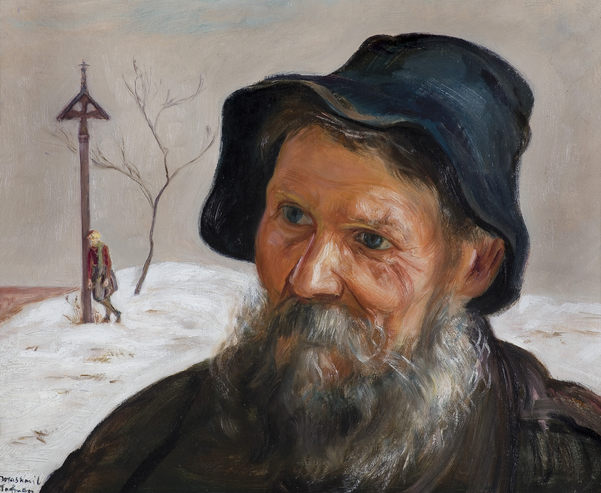 Wlastimil Hofman / Vlastimil Hofmann (Praga 1881 - Szklarska Poręba 1970) studiował w krakowskiej Szkole Sztuk Pięknych - początkowo pod kierunkiem Floriana Cynka, później także u Jana Stanisławskiego, Leona Wyczółkowskiego i Jacka Malczewskiego. W latach 1899-1902 uczył się jeszcze u Jeana Léona Gérôme’a w paryskiej École des Beaux-Arts. W czasie I wojny światowej przebywał w Pradze i w Paryżu; od 1920 stale mieszkał w Krakowie. Dużo wystawiał; należał do wielu stowarzyszeń twórczych - był współzałożycielem „Grupy Pięciu” (1905) i „Grupy Zero” (1908), członkiem Związku Artystów Czeskich „Manes”, a od 1911 członkiem Tow. Artystów Polskich „Sztuka”. W czasie II wojny światowej poprzez ZSRR i Turcję przedostał się do Jerozolimy, skąd w roku 1946 wrócił do Krakowa. Od roku 1947 stale mieszkał w Szklarskiej Porębie. Hofman malował przede wszystkim fantastyczno-symboliczne kompozycje o motywach ludowych oraz sceny rodzajowe, portrety i pejzaże. Jego obrazy mimo bliskich analogii i powiązań ze sztuką Malczewskiego odznaczają się zawsze indywidualnym charakterem, stylem i nastrojem.