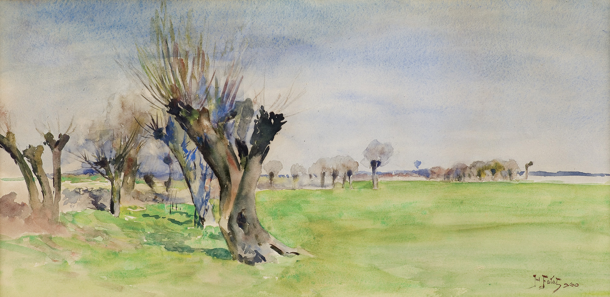 Julian Fałat (Tuligłowy [okręg lwowski] 1853 - Bystra k. Bielska 1929) - malarz i pedagog - jeden z najwybitniejszych artystów polskich okresu przełomu XIX i XX wieku, członek polskich i europejskich stowarzyszeń twórczych oraz Królewskiej Akademii Sztuk Pięknych w Berlinie, wielokrotnie odznaczany medalami na wystawach międzynarodowych. Studiował malarstwo u Władysława Łuszczkiewicza i Leona Dembowskiego w Szkole Sztuk Pięknych w Krakowie (1868-71 i 1881) i w Akademii Sztuk Pięknych w Monachium u Alexandra Strähubera i Johana Leonhardta Raaba (1877-80). Po studiach spędził kilka miesięcy w Rzymie, w 1884 był w Paryżu i w Hiszpanii, a w 1885 odbył podróż morską dookoła świata. W 1886 podczas polowania u ks. Radziwiłłów w Nieświeżu poznał późniejszego cesarza Niemiec Wilhelma II - dla którego następnie w latach 1886-95 pracował w Berlinie jako malarz nadworny. W latach 1894-96 współpracował z Wojciechem Kossakiem przy panoramie Berezyna. W 1895 został powołany na stanowisko dyrektora Szkoły Sztuk Pięknych w Krakowie, w której gruntownie zreformował system nauczania, przekształcając tę uczelnię w nowoczesną Akademię Sztuk Pięknych (r.1900). Do roku 1910 był rektorem Akademii; po przejściu na emeryturę osiadł w miejscowości Bystra k. Bielska. Znakomity akwarelista, malował także olejno. We wcześniejszym okresie tworzył w konwencji realistycznej, z czasem rozjaśnił i wzbogacił paletę, a w akwarelach wprowadzał rozlewną plamę barwną. Zasłynął jako malarz scen myśliwskich rozgrywających się najczęściej w zimowej scenerii; malował też pejzaże, wiejskie sceny rodzajowe, portrety, widoki miejskie.