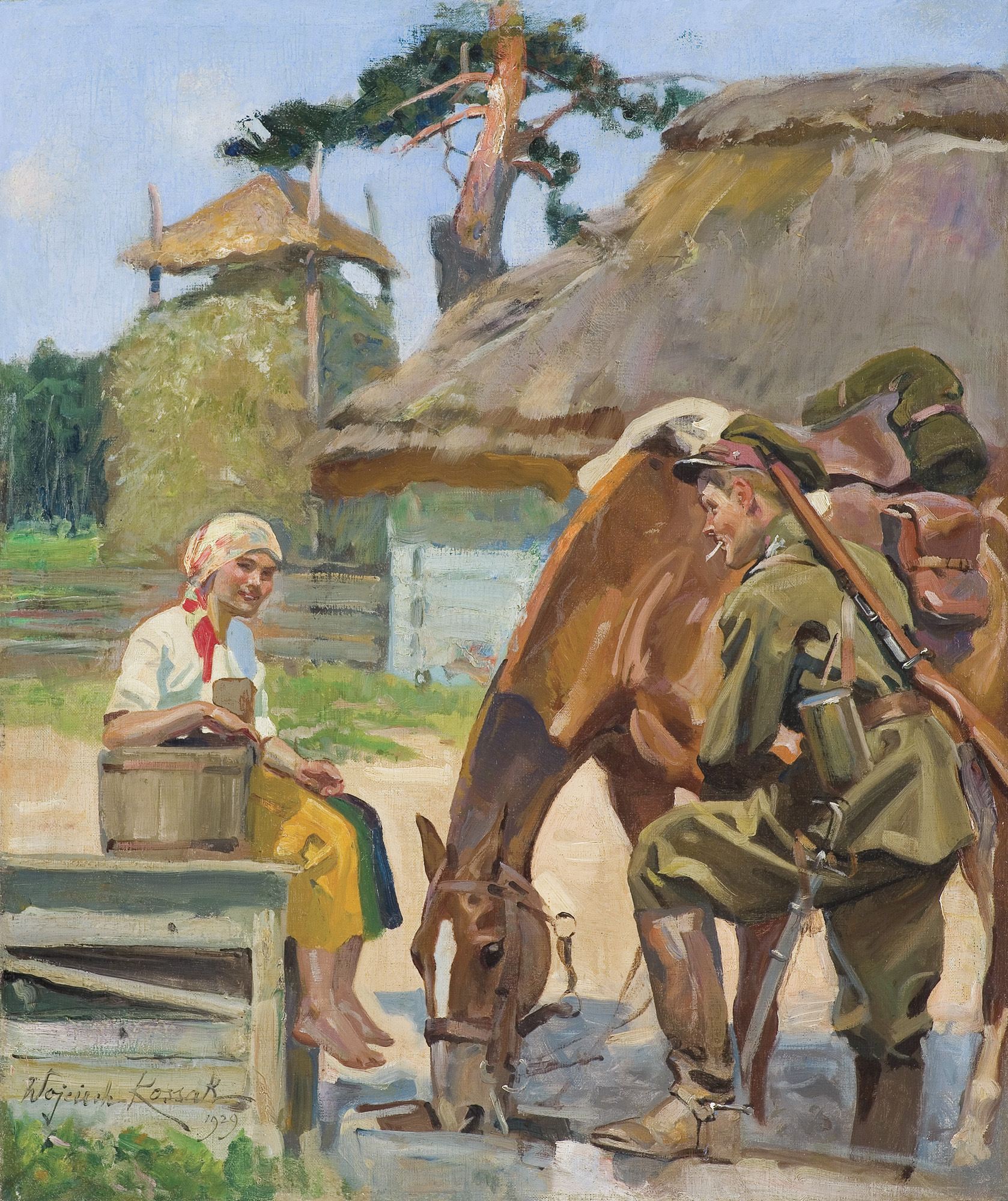Wojciech Kossak (Paryż 1856 - Kraków 1942 ) – powszechnie znany malarz, postrzegany przede wszystkim jako świetny batalista. Syn i uczeń Juliusza Kossaka kształcił się w krakowskiej Szkole Sztuk Pięknych, w Akademii monachijskiej oraz w Paryżu. W latach 1895-1902 przebywał głównie w Berlinie, pracując dla cesarza Wilhelma II. Wiele podróżował, m.in. do Hiszpanii i Egiptu, gdzie wykonywał szkice do zamierzonych panoram. W późniejszych latach kilkakrotnie wyjeżdżał do Stanów Zjednoczonych wykonując zamówienia portretowe. W 1913 był mianowany profesorem warszawskiej Szkoły Sztuk Pięknych. W latach I wojny światowej pełnił służbę wojskową. Był współautorem panoram: „Racławice” (1893-1894), „Berezyna” (1895-1896), „Bitwa pod piramidami” (1901) oraz szkiców do niezrealizowanej „Somosierry” (1900). Z temperamentem i swobodą tworzył szeroko malowane, dynamiczne sceny batalistyczne, historyczne, rodzajowe oraz liczne portrety. Z upodobaniem malował konie. Jego obrazy, gloryfikujące dawne i współczesne artyście polskie wojsko i bohaterstwo żołnierzy, trafiały do patriotycznych uczuć odbiorców i cieszyły się ogromna popularnością.